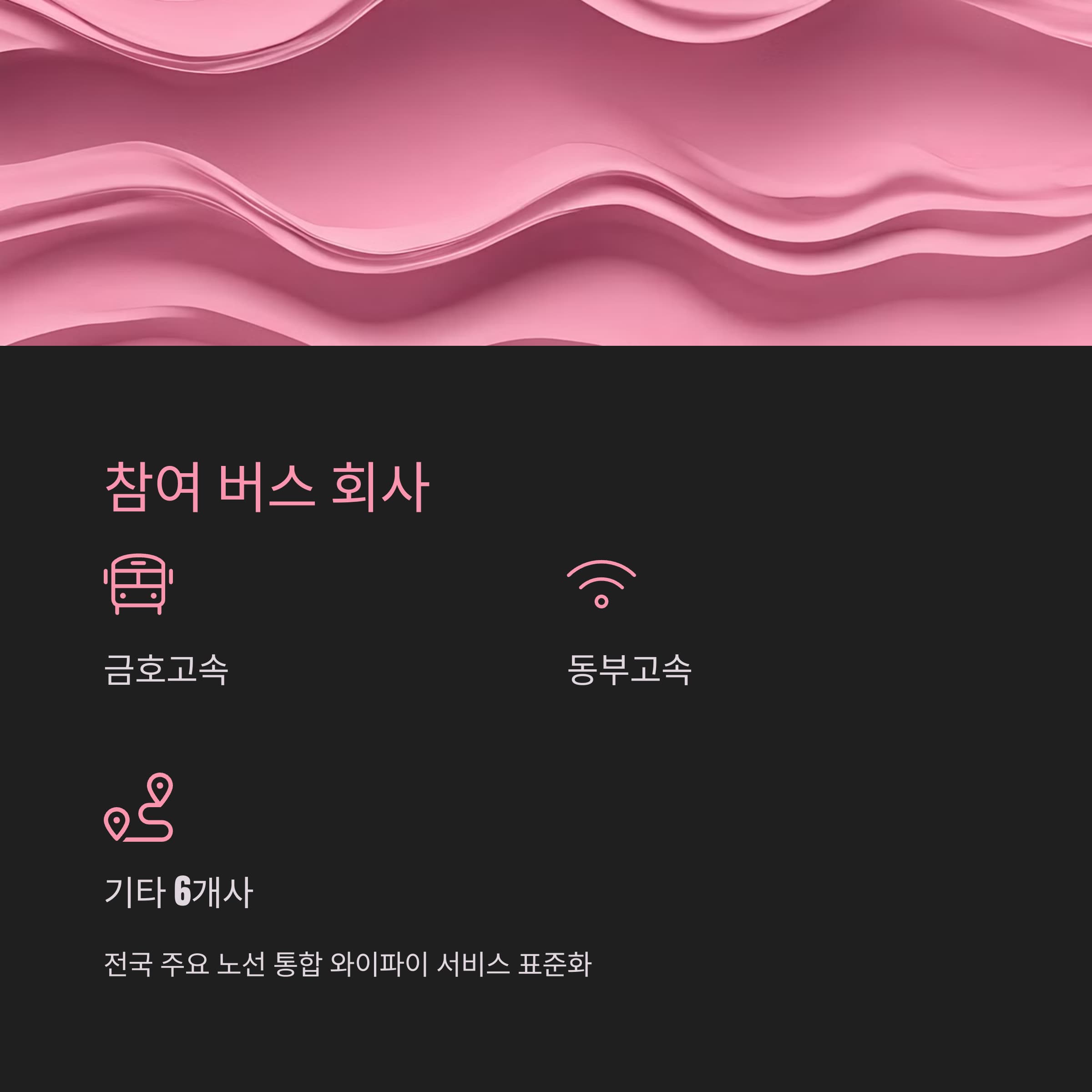 금호고속, 동부고속, 동양고속, 삼화고속, 속리산고속, 중앙고속, 천일고속, 한일고속 등 8개 주요 고속버스 회사의 240개 노선, 총 1,724대의 차량에서 서비스를 제공합니다.