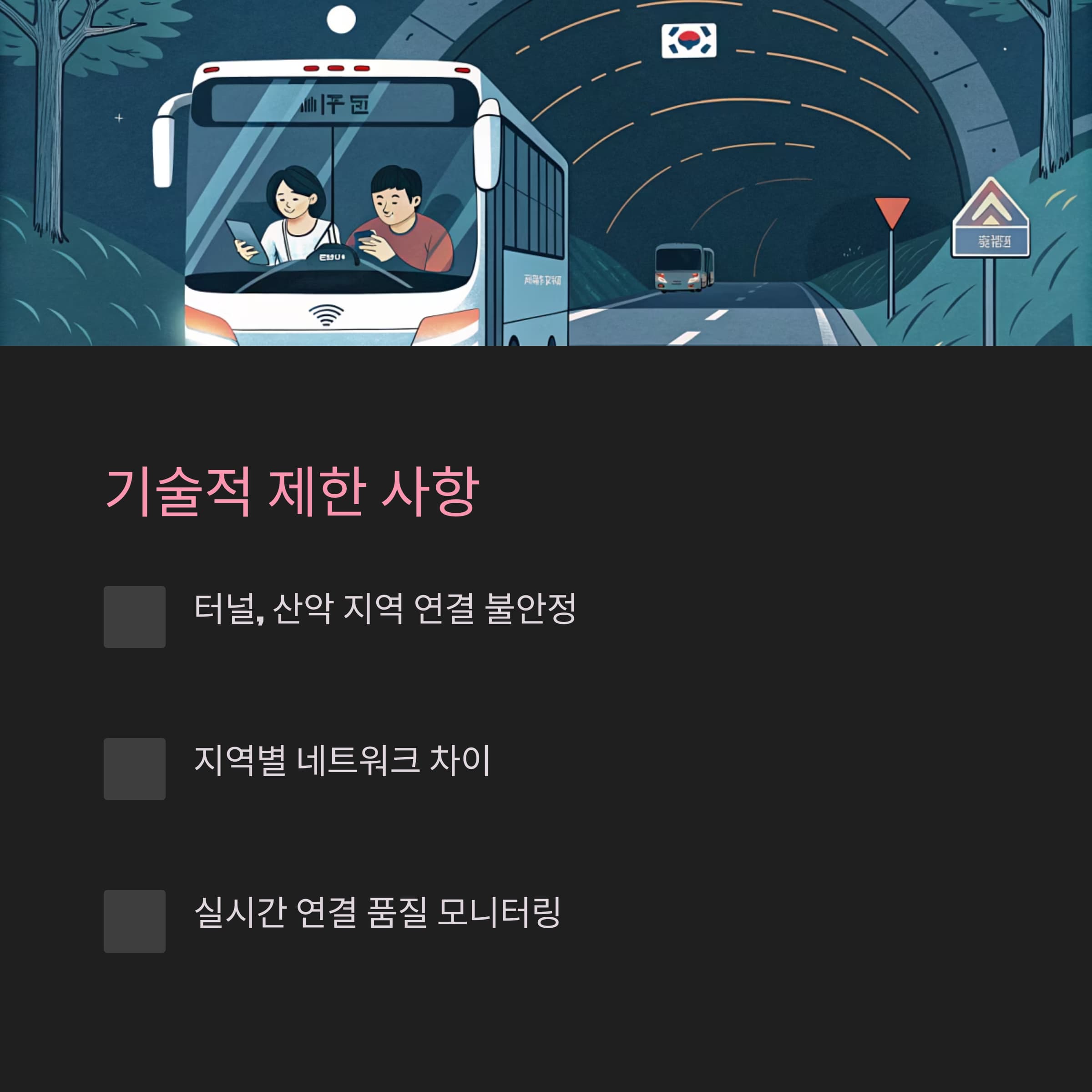 - 연결 끊김 가능성: 터널이나 산악 지역에서는 일시적으로 연결이 끊길 수 있습니다.