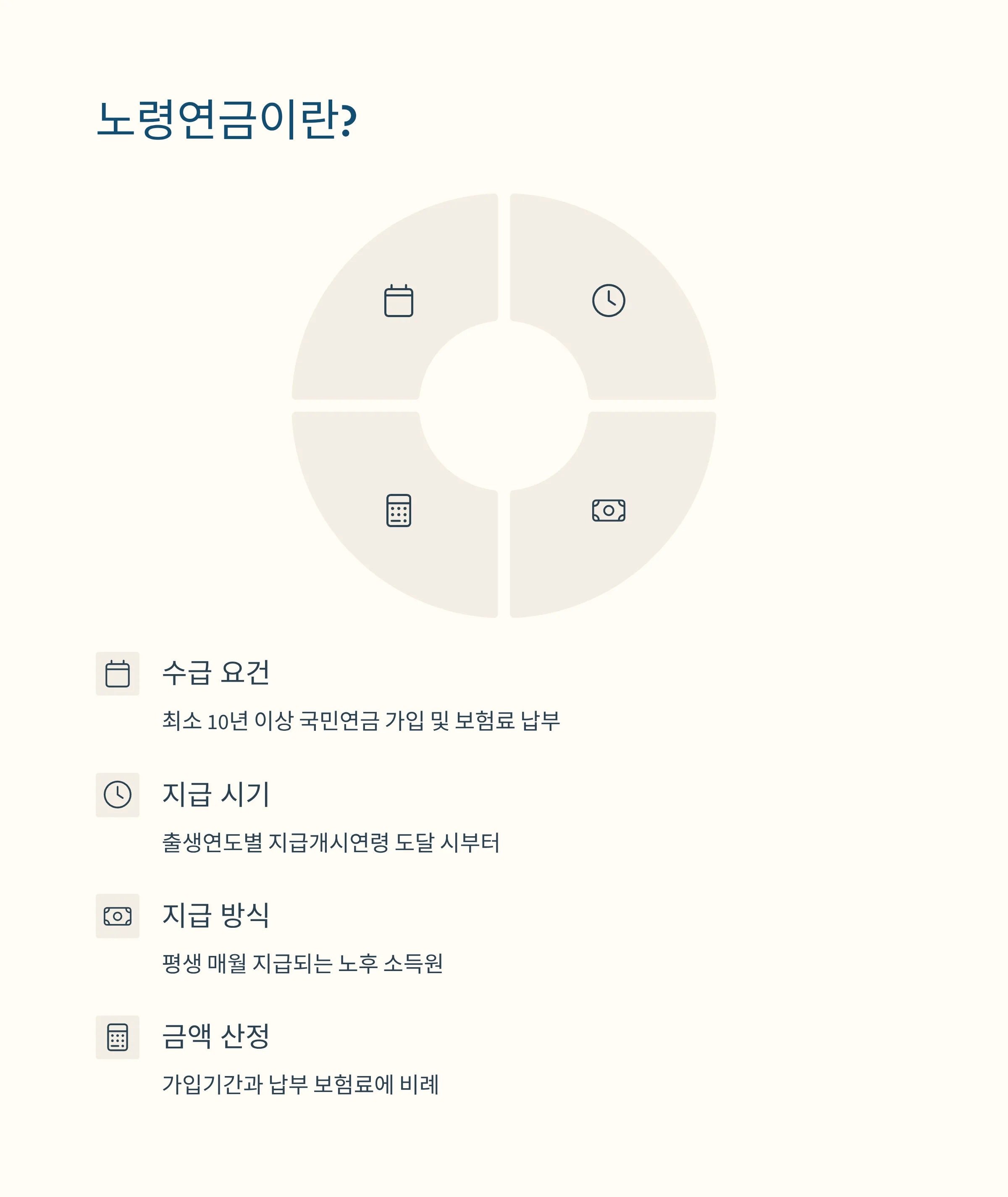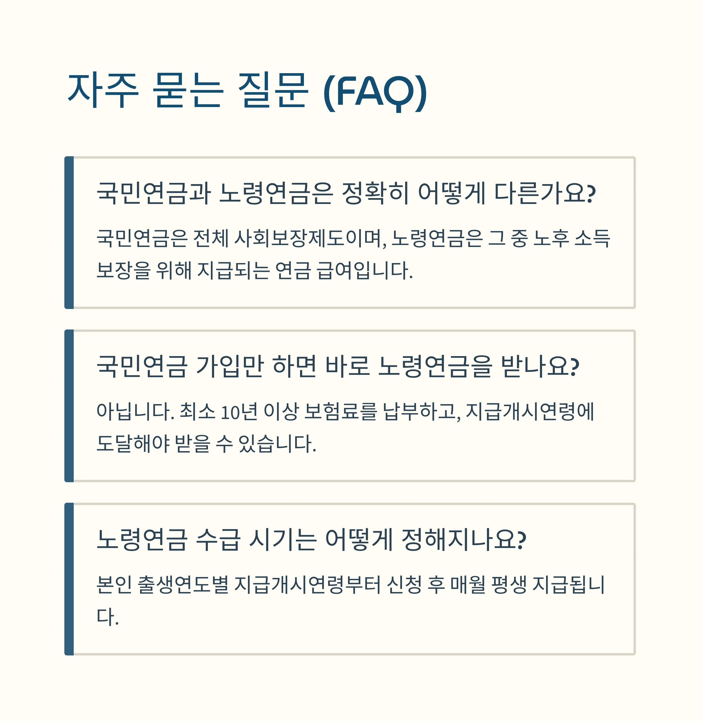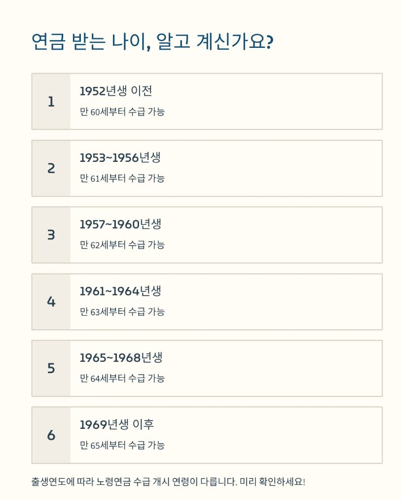 - 노령연금: 최소 10년 이상 국민연금 가입 후, 해당 지급개시연령 도달 시 지급