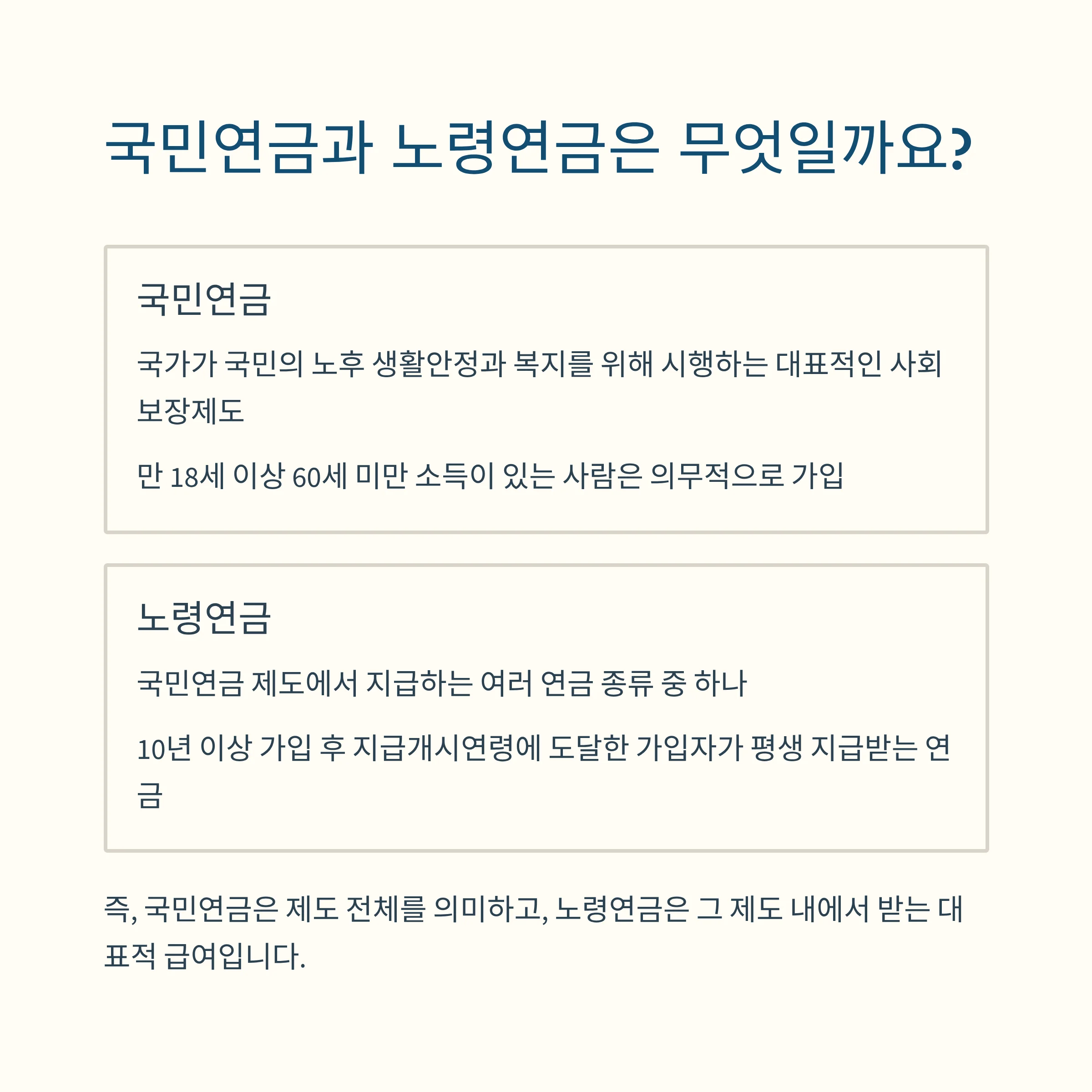 | 의미 | 국가가 운영하는 사회보험 및 노후보장 제도 전체 | 국민연금 가입 후 지급 조건 충족 시 받는 노후 소득 연금 |