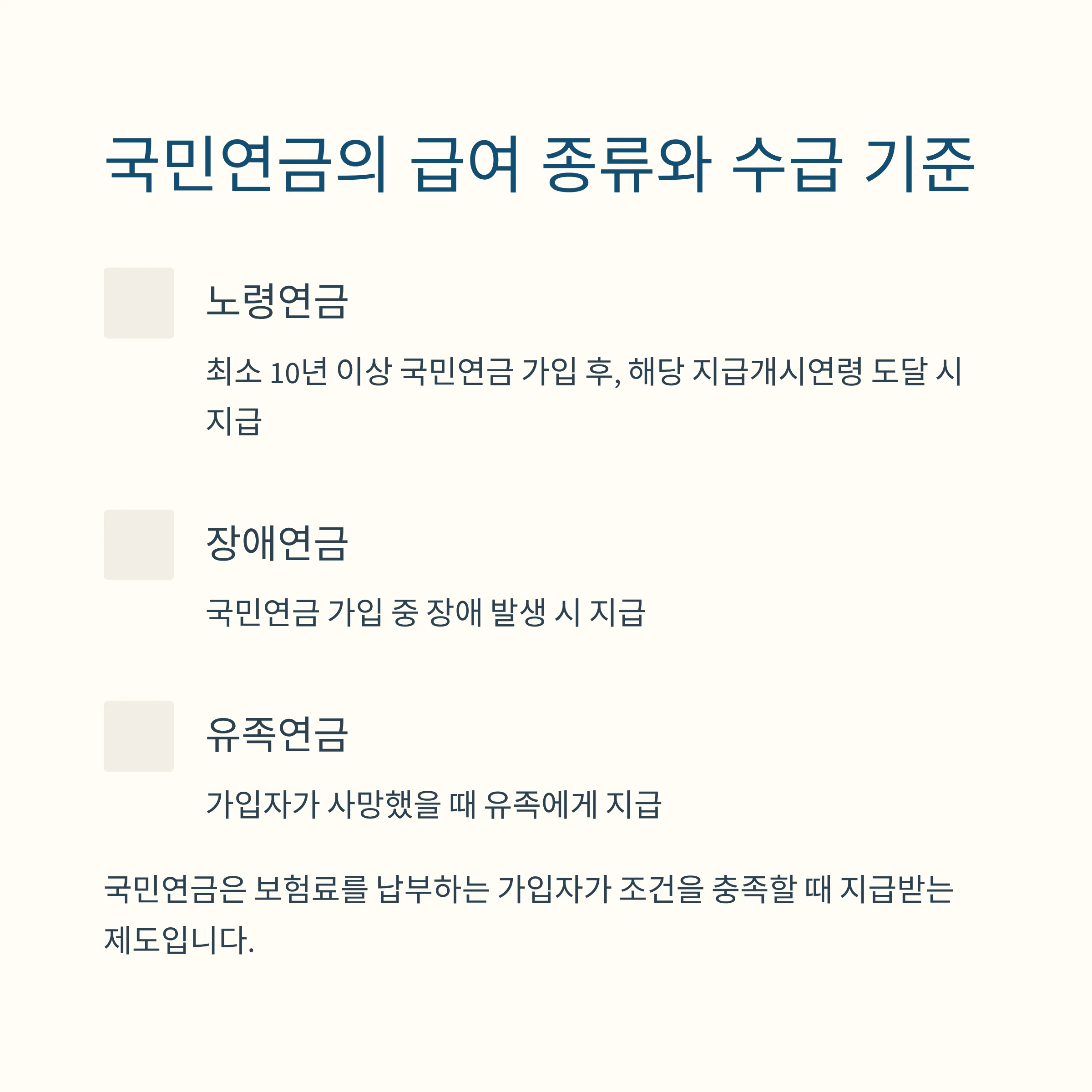 이처럼 국민연금은 보험료를 납부하는 가입자가 보험료 납부 기간 및 조건을 충족할 때 지급받는 제도이며, 각각의 급여는 별도의 요건과 지급 조건이 있습니다.