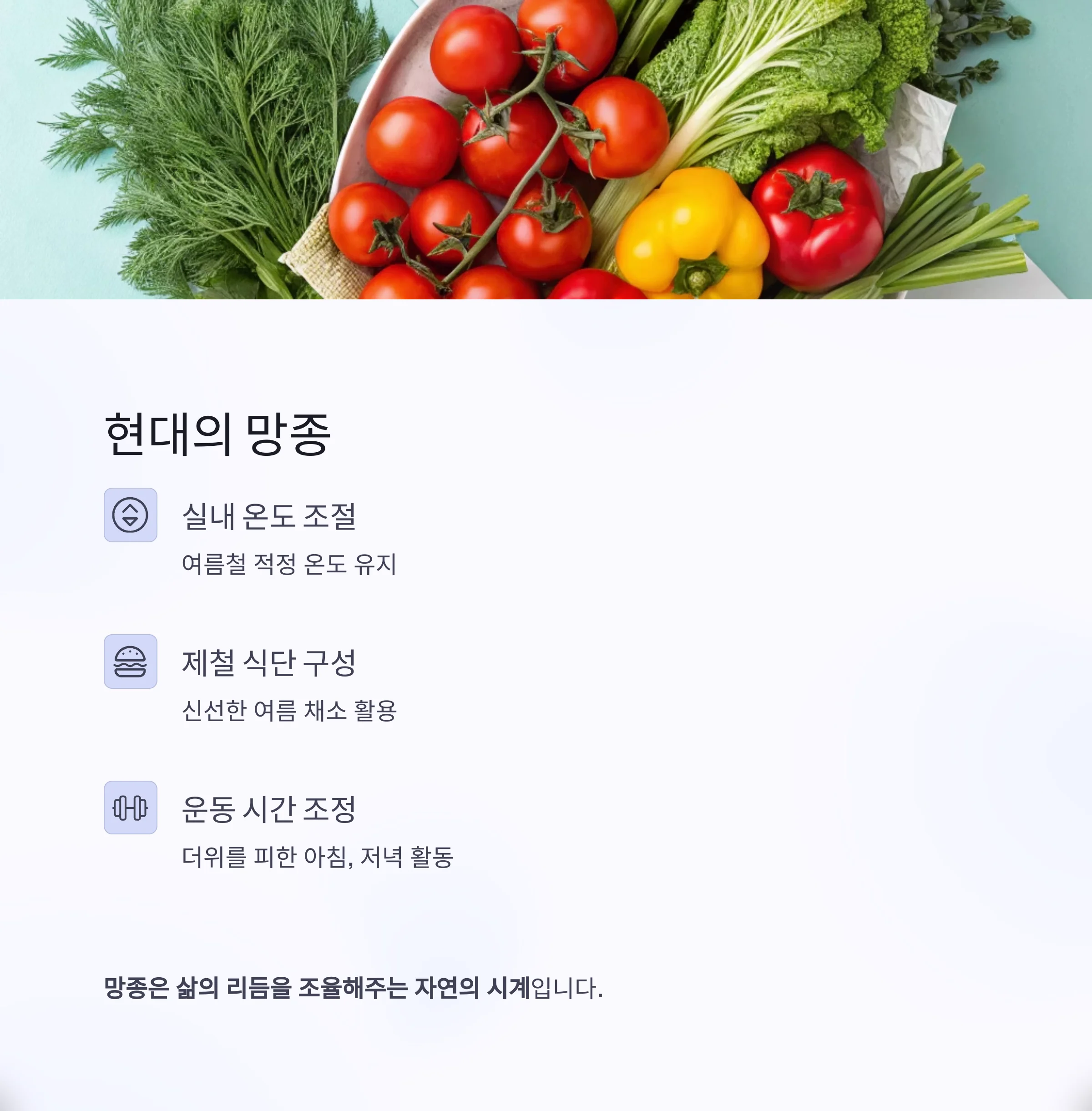 실내 온도 조절, 제철 식단 구성, 여름철 운동 시간 조정 등이 그 예입니다.