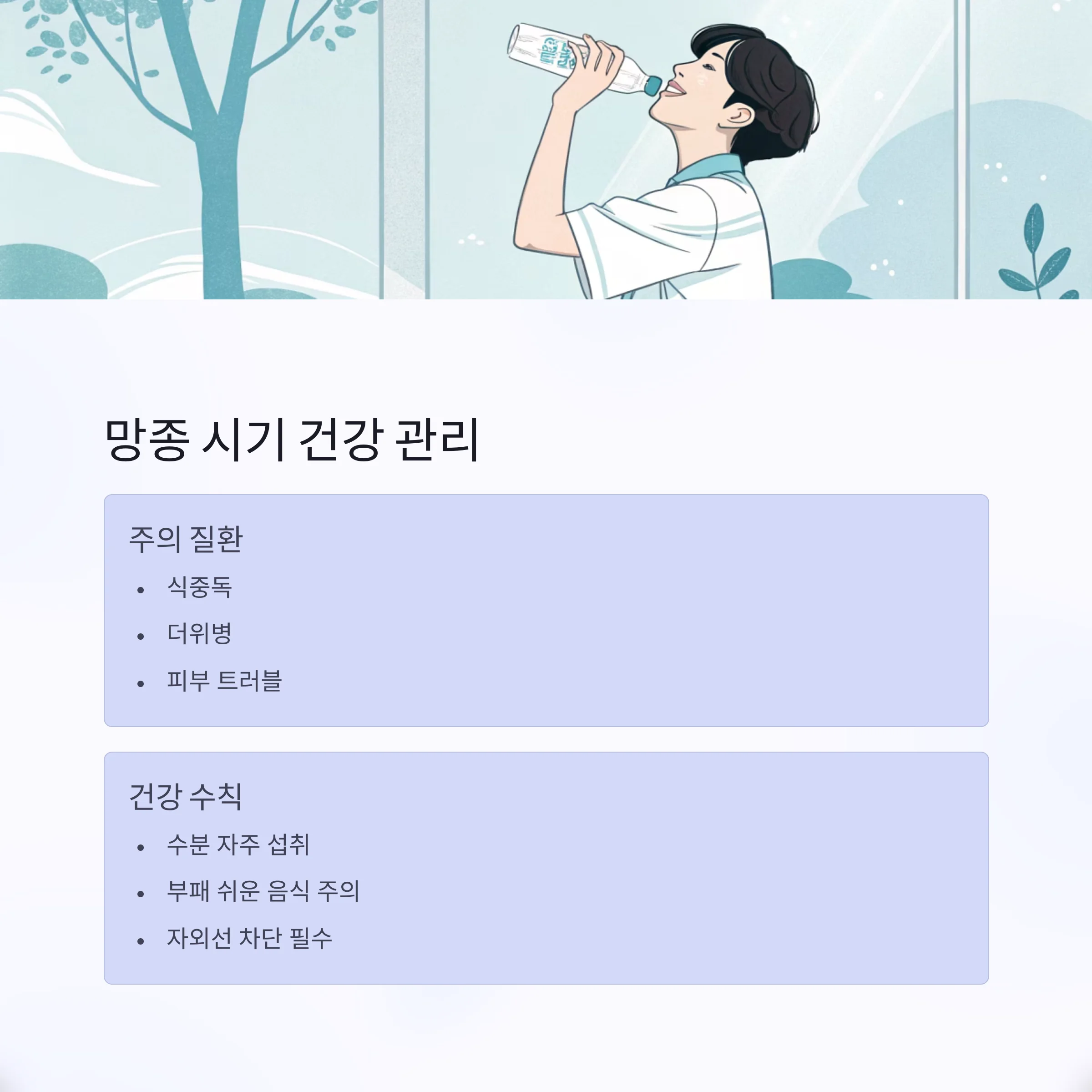 | 건강 팁 | 수분 섭취, 자외선 차단, 식중독 예방 |