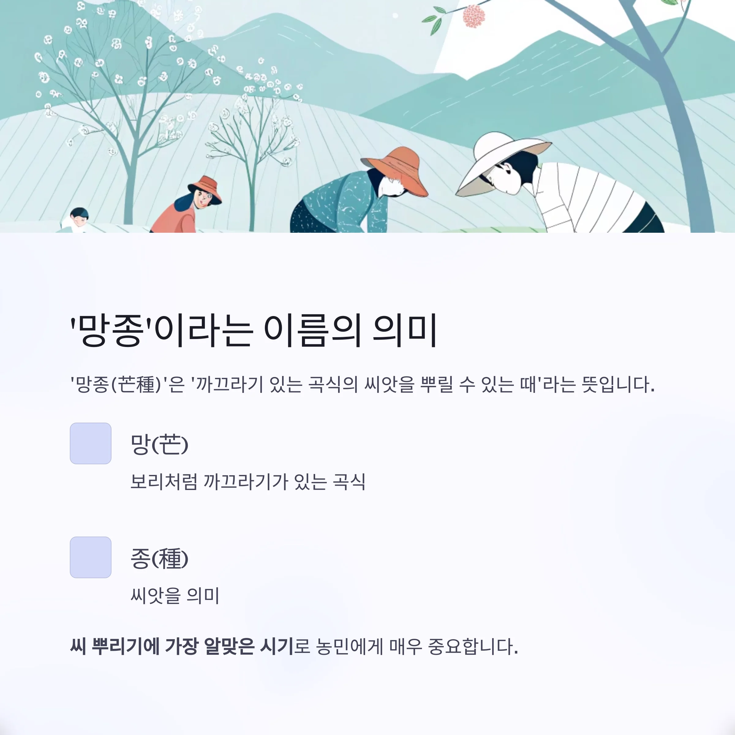 '망(芒)'은 보리처럼 까끄라기가 있는 곡식을 뜻하고, '종(種)'은 씨앗을 의미합니다.