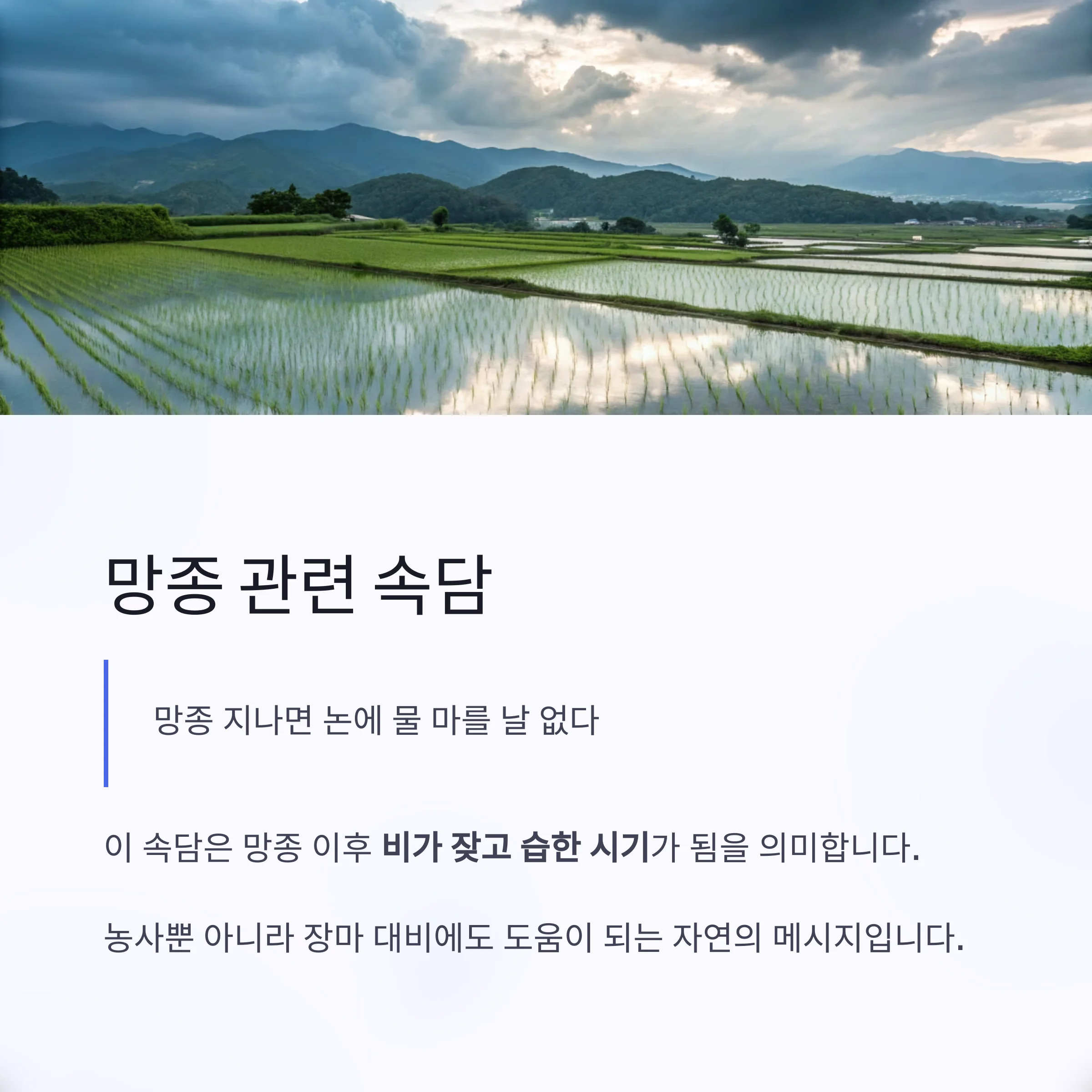 '망종 지나면 논에 물 마를 날 없다'는 말은 이 시기부터 비가 잦고 습한 시기임을 뜻합니다.