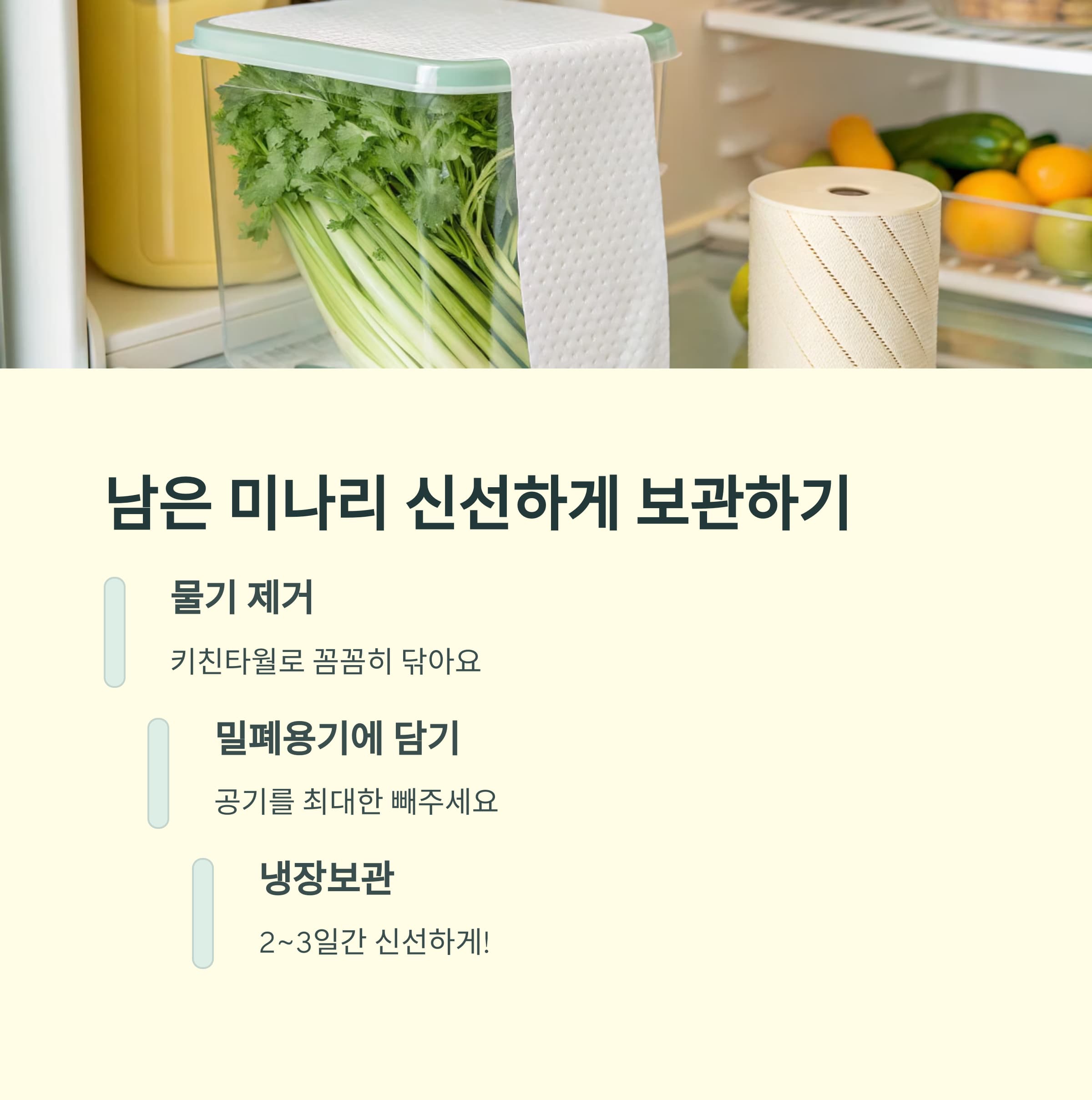 | 다양한 요리에 활용 가능해 실용적 | 아삭함과 향을 최대한 유지할 수 있어요 | 양념장은 미리 섞어 숙성시키는 게 포인트 |