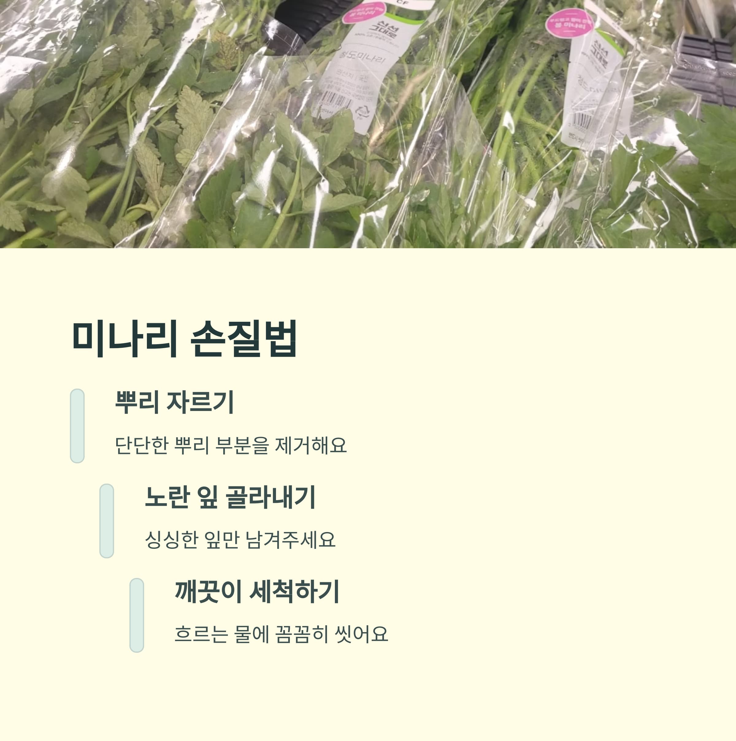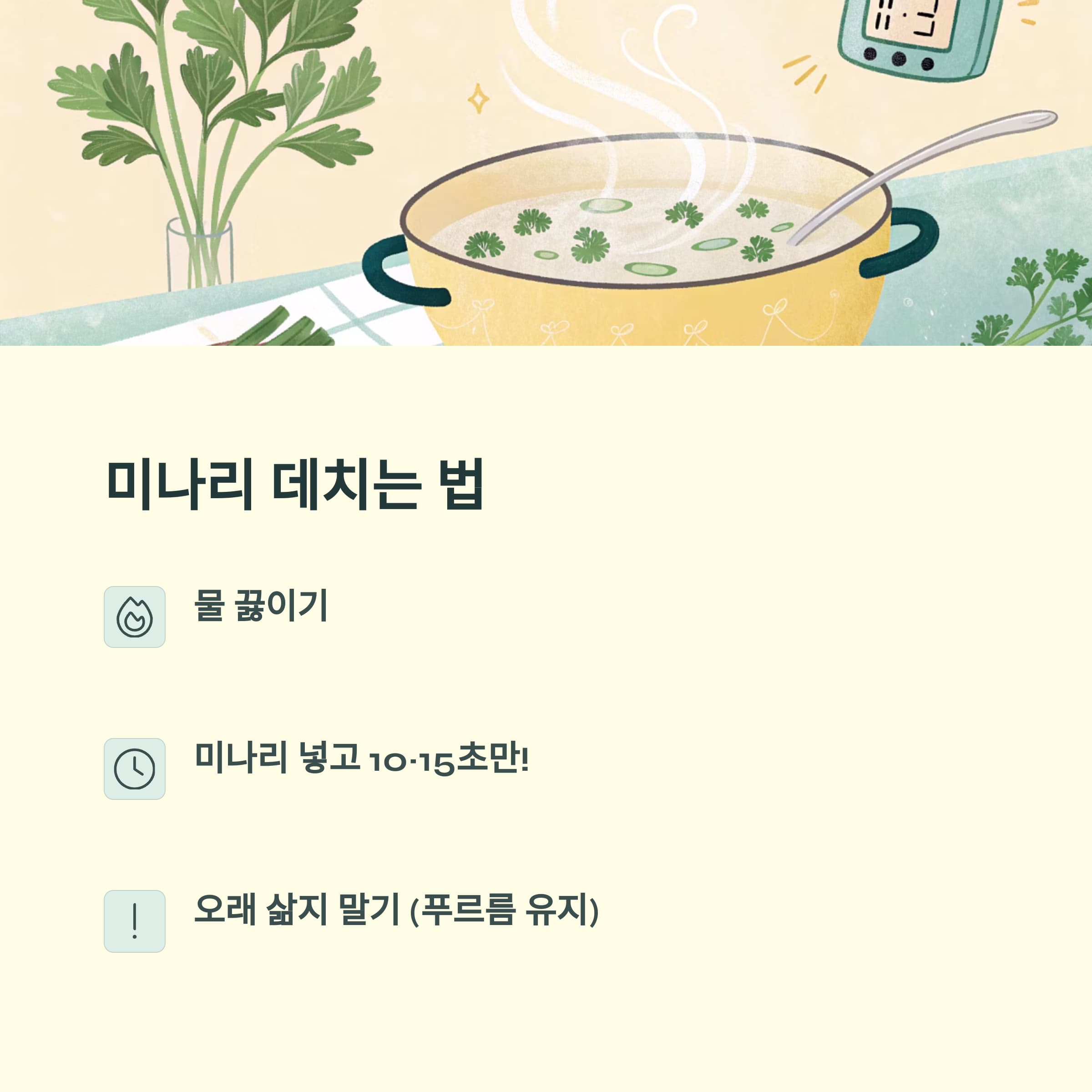 미나리는 반드시 신선한 상태에서 조리해야 하며, 데칠 때는 소금을 살짝 넣어 색을 살리는 것이 팁입니다.
