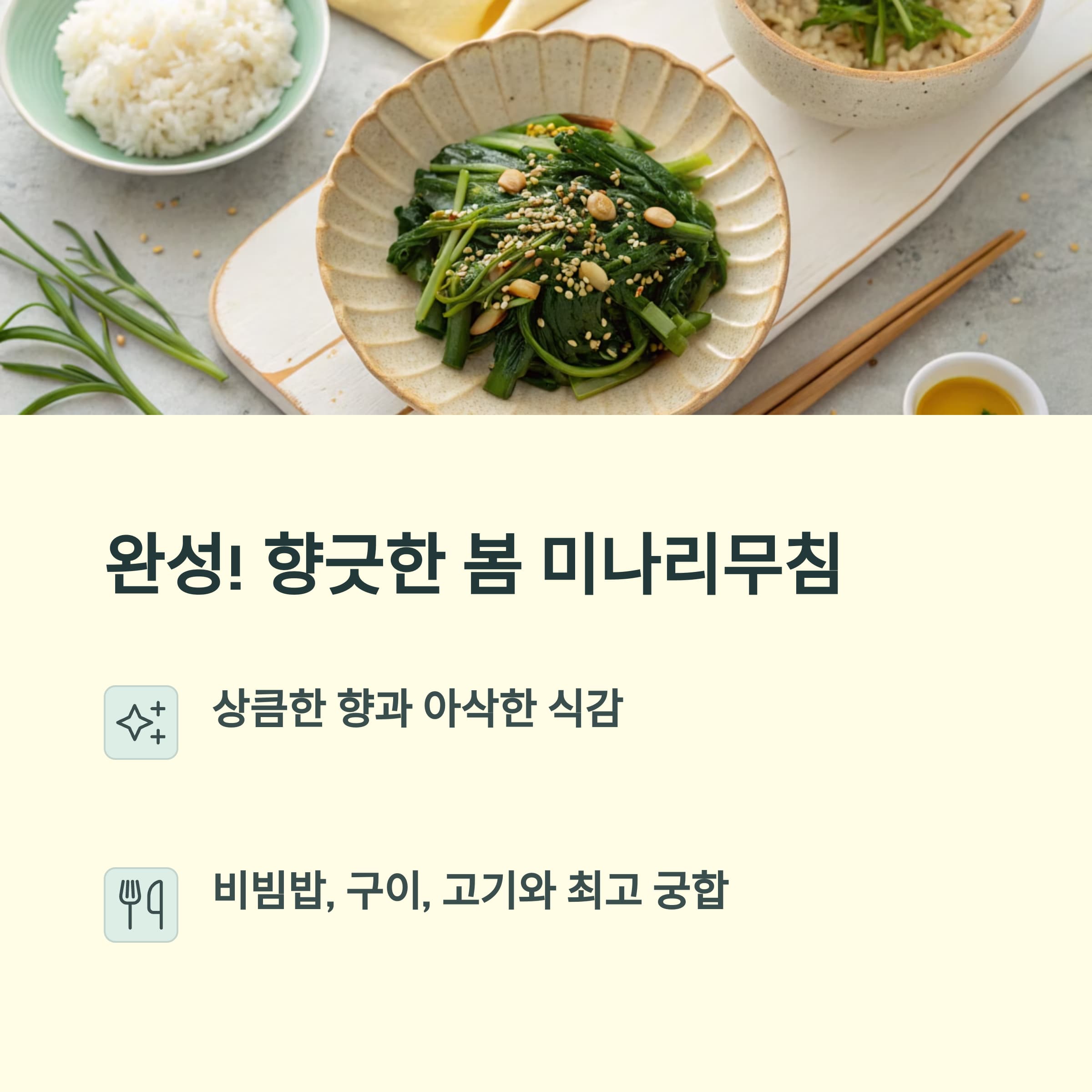 밥반찬으로도, 비빔밥 재료로도 찰떡궁합인 이 미나리무침 하나면 봄철 입맛 살리기 성공입니다.