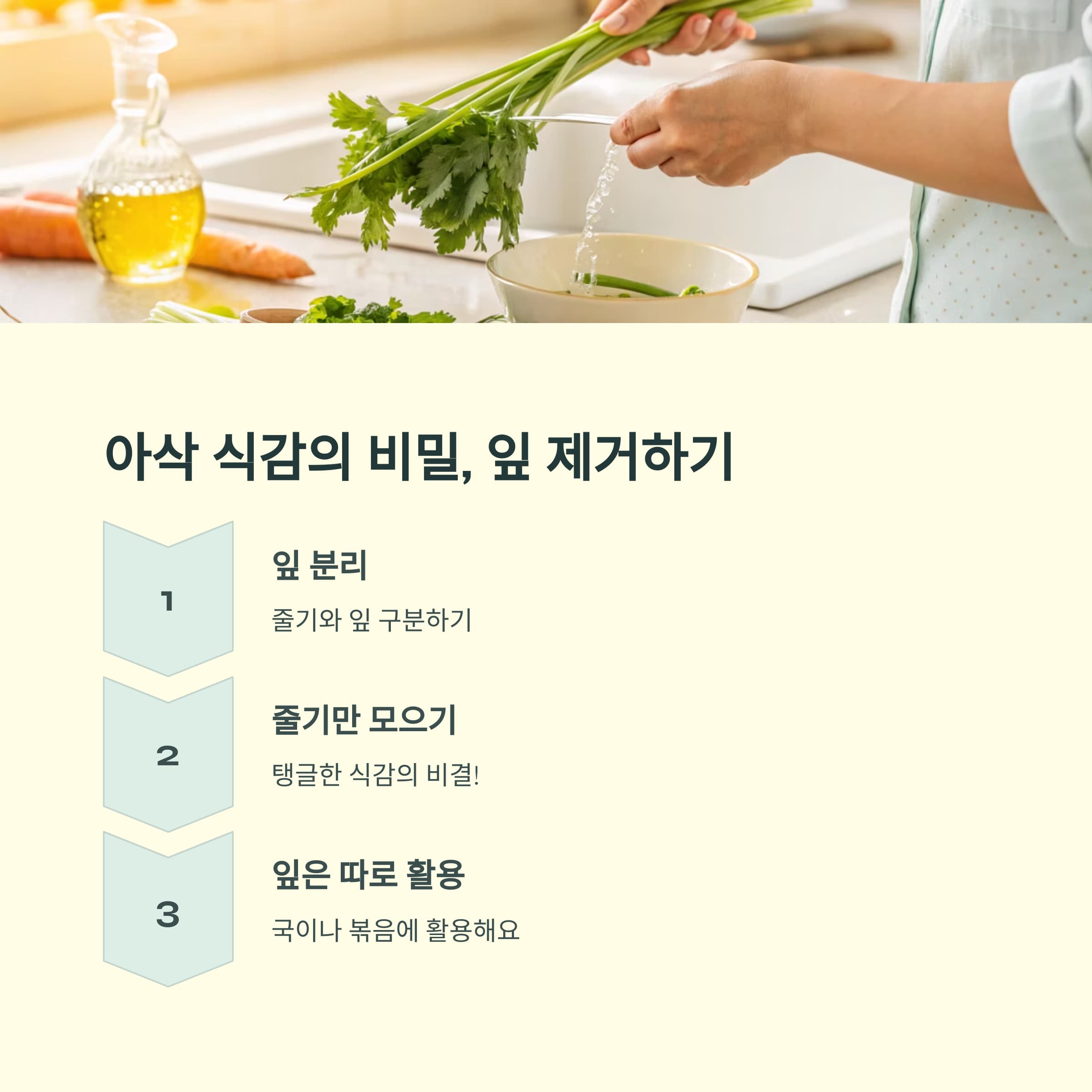 | 손질 팁 | 잎은 제거하고 연한 줄기만 사용하면 식감이 살아나요. |
