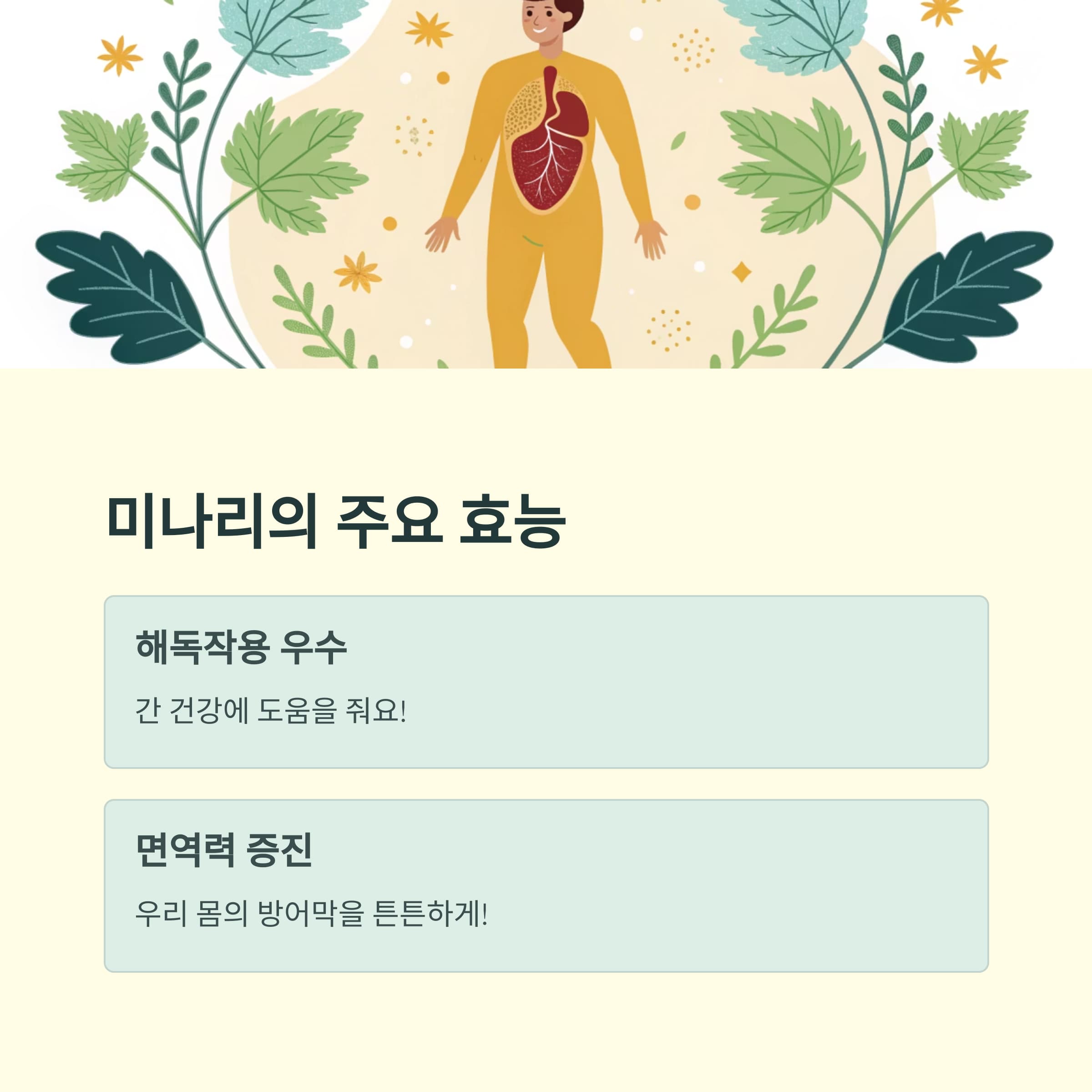 | 미나리 효능 | 해독작용, 간 기능 보호, 면역력 증진에 탁월해요. |
