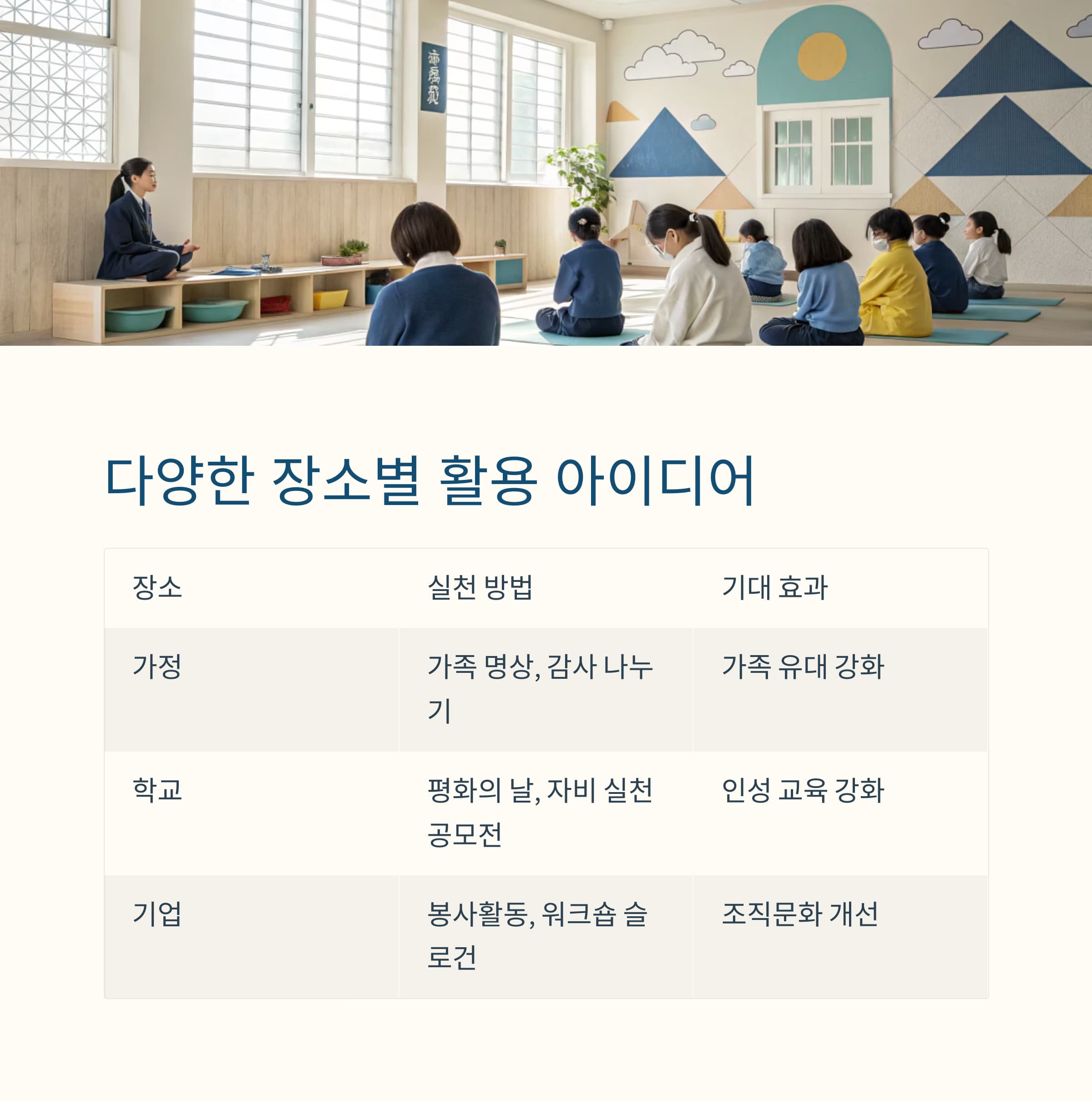 | 가정 | 가족 명상, 감사 나누기 | 가족 간 유대 강화 |