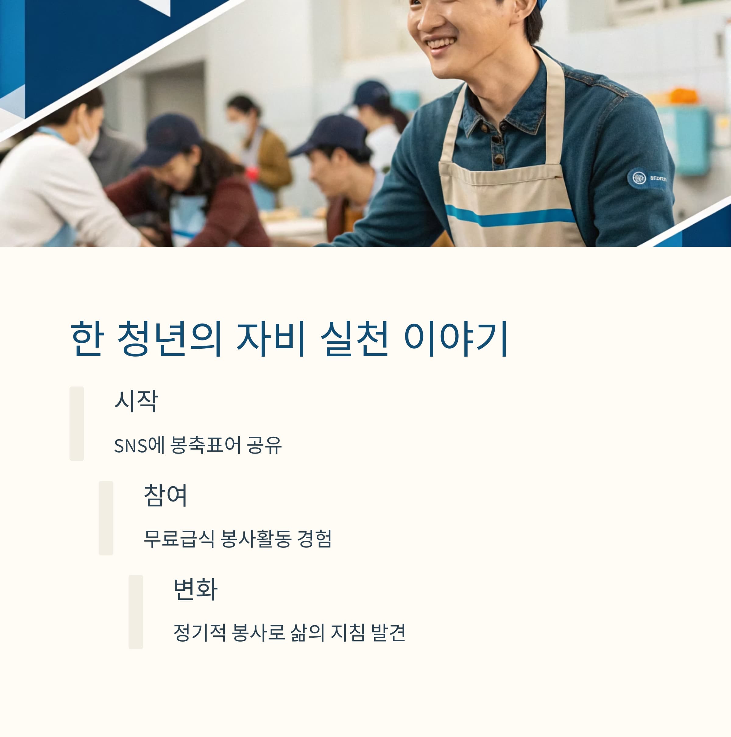 그러다 우연히 동네의 무료급식 봉사에 참여하게 됐고, 그곳에서 타인을 돕는 즐거움과 마음의 평온을 느끼게 됐습니다.