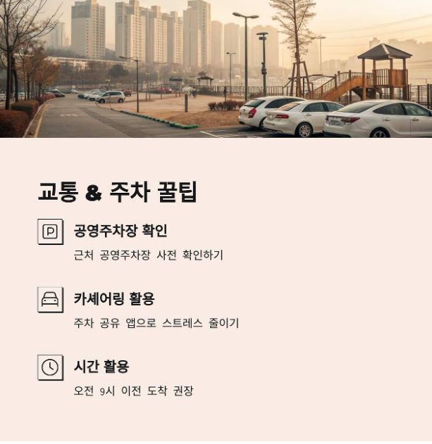 - 차량 이용 시, 인근 공영주차장 사전 확인 및 카셰어링·주차 공유 앱 활용을 추천합니다.
