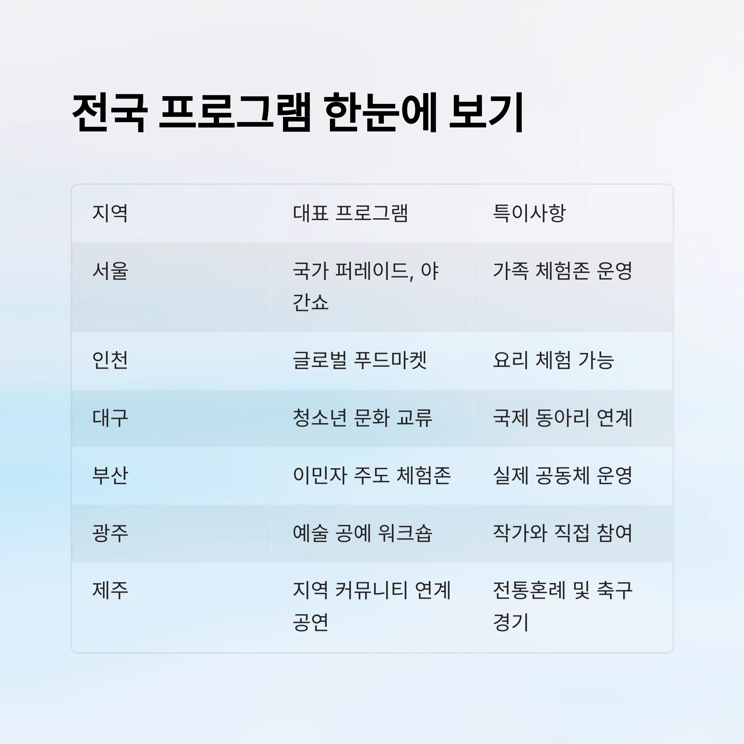 | 지역 | 대표 프로그램 | 특이사항 |