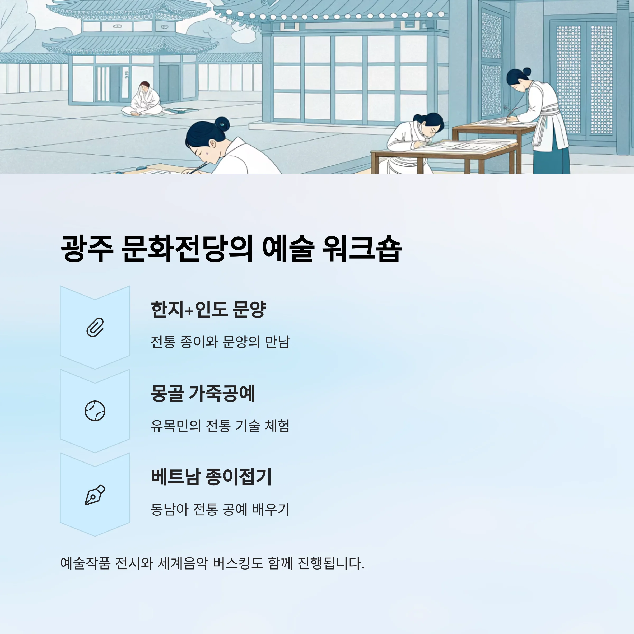 | 광주 | 예술 공예 워크숍 | 작가와 직접 참여 |