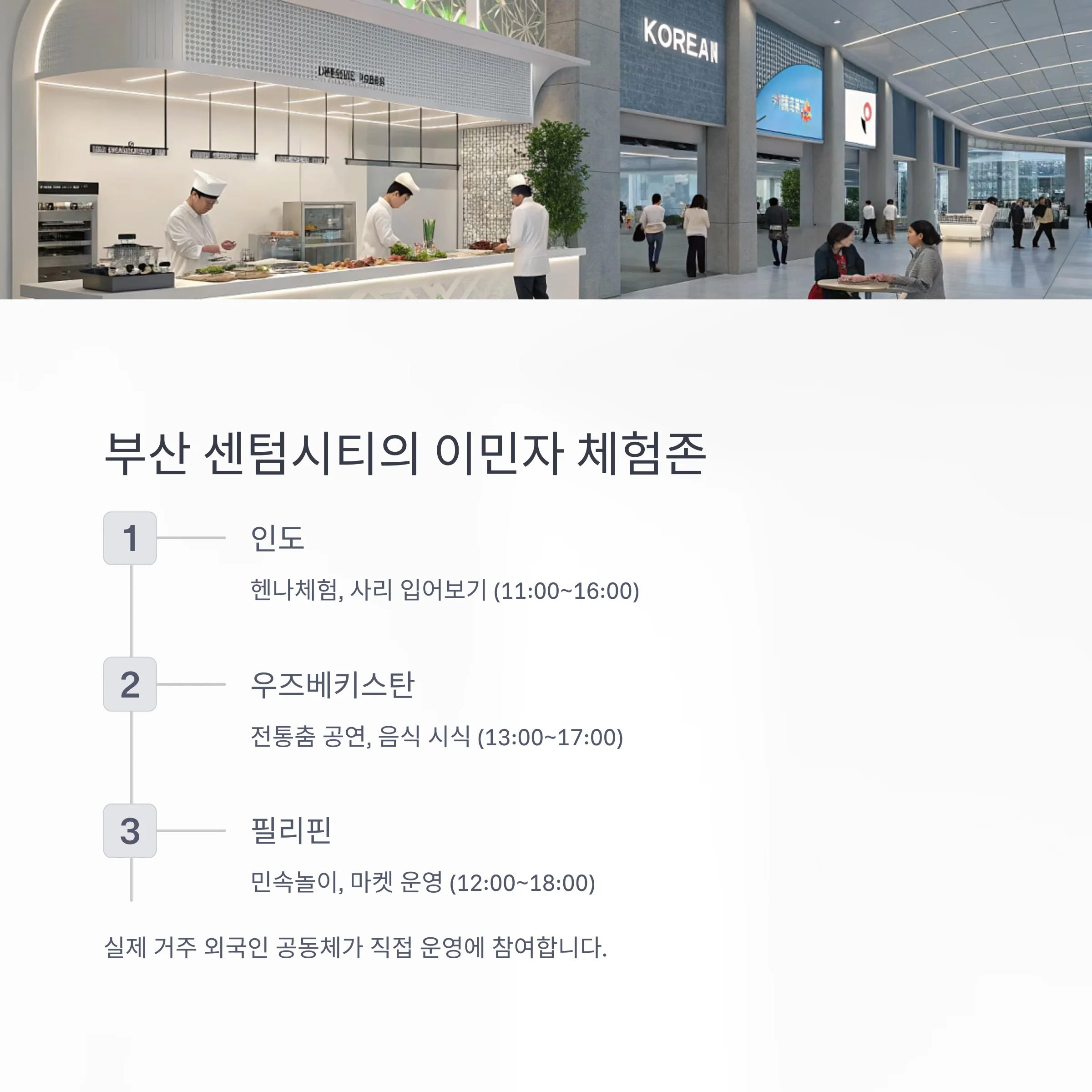 | 부산 | 이민자 주도 체험존 | 실제 공동체 운영 |