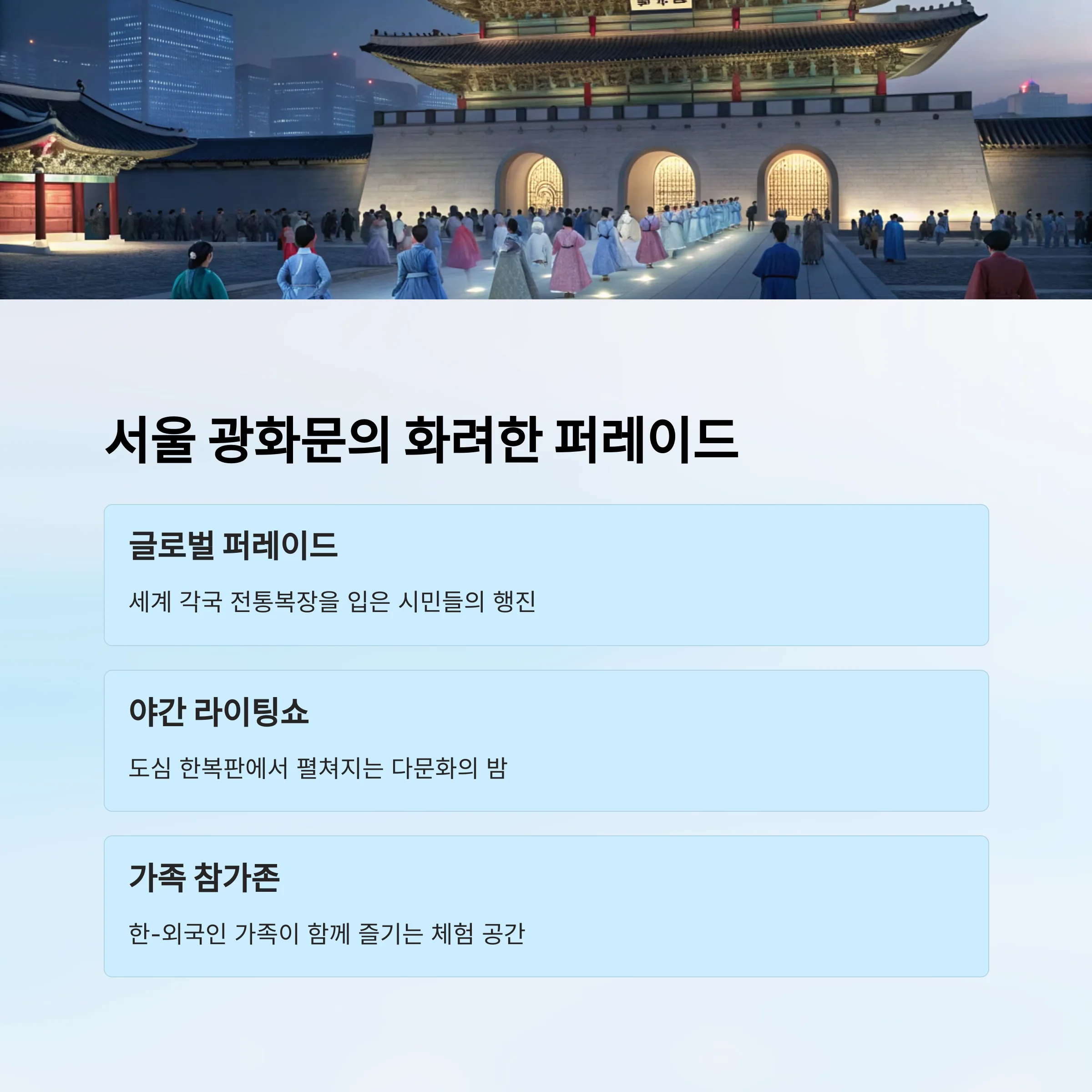 | 서울 | 국가 퍼레이드, 야간쇼 | 가족 체험존 운영 |