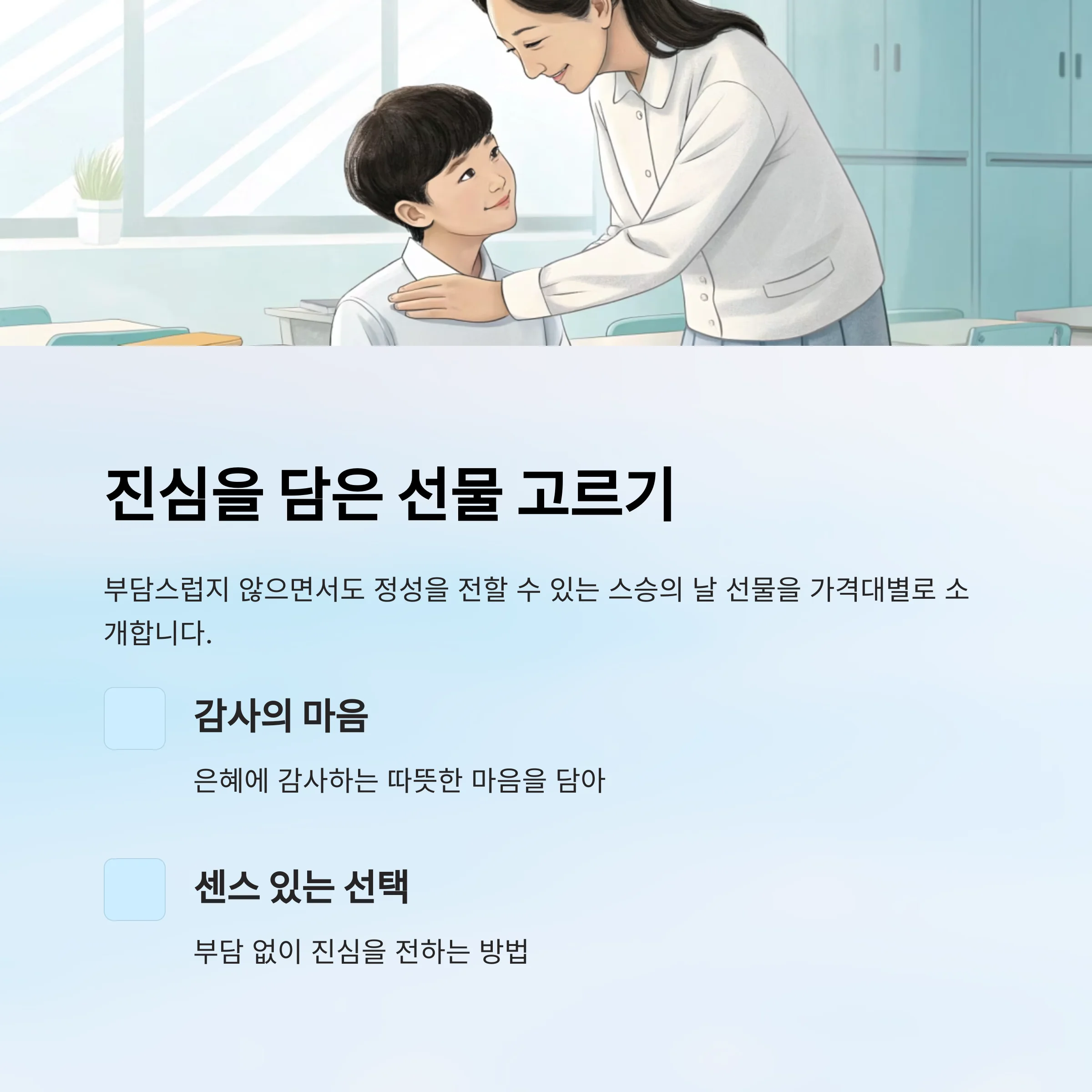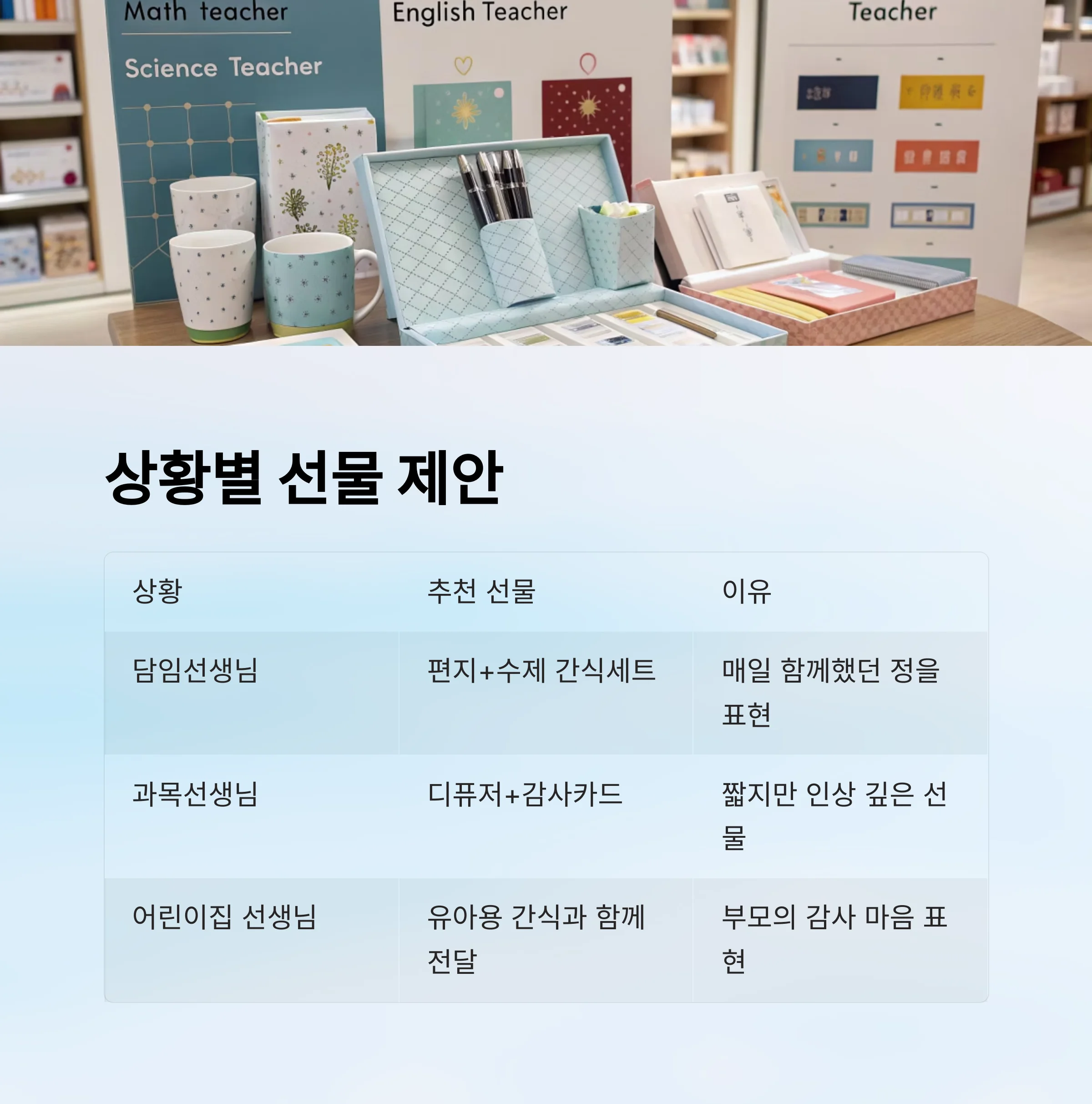 본 글에서는 가격대별로 추천할 만한 스승의 날 선물을 소개하고, 오히려 피해야 할 선물에 대해서도 함께 안내드립니다.