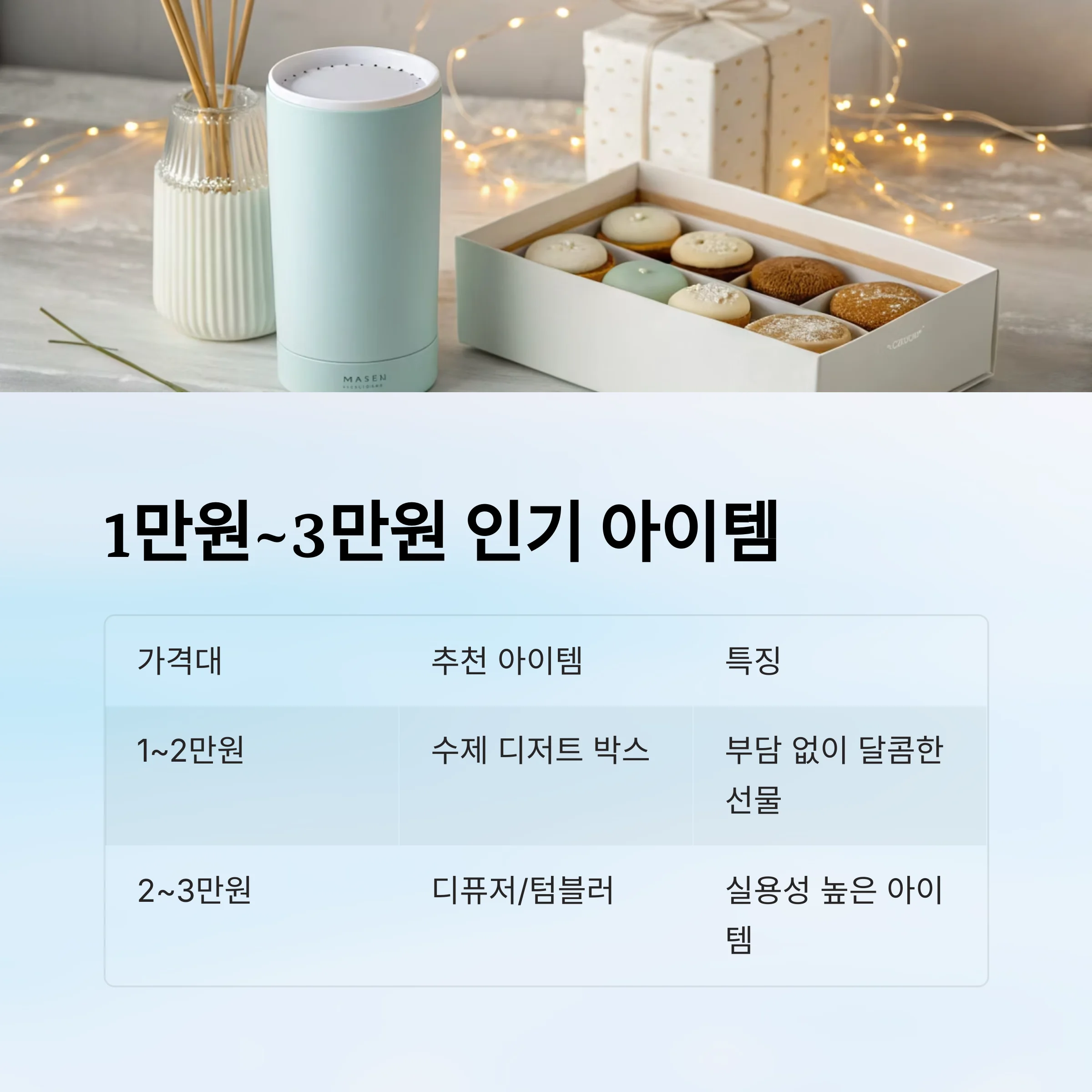 | 2~3만원 | 디퓨저/텀블러 | 실용성 높은 아이템 |