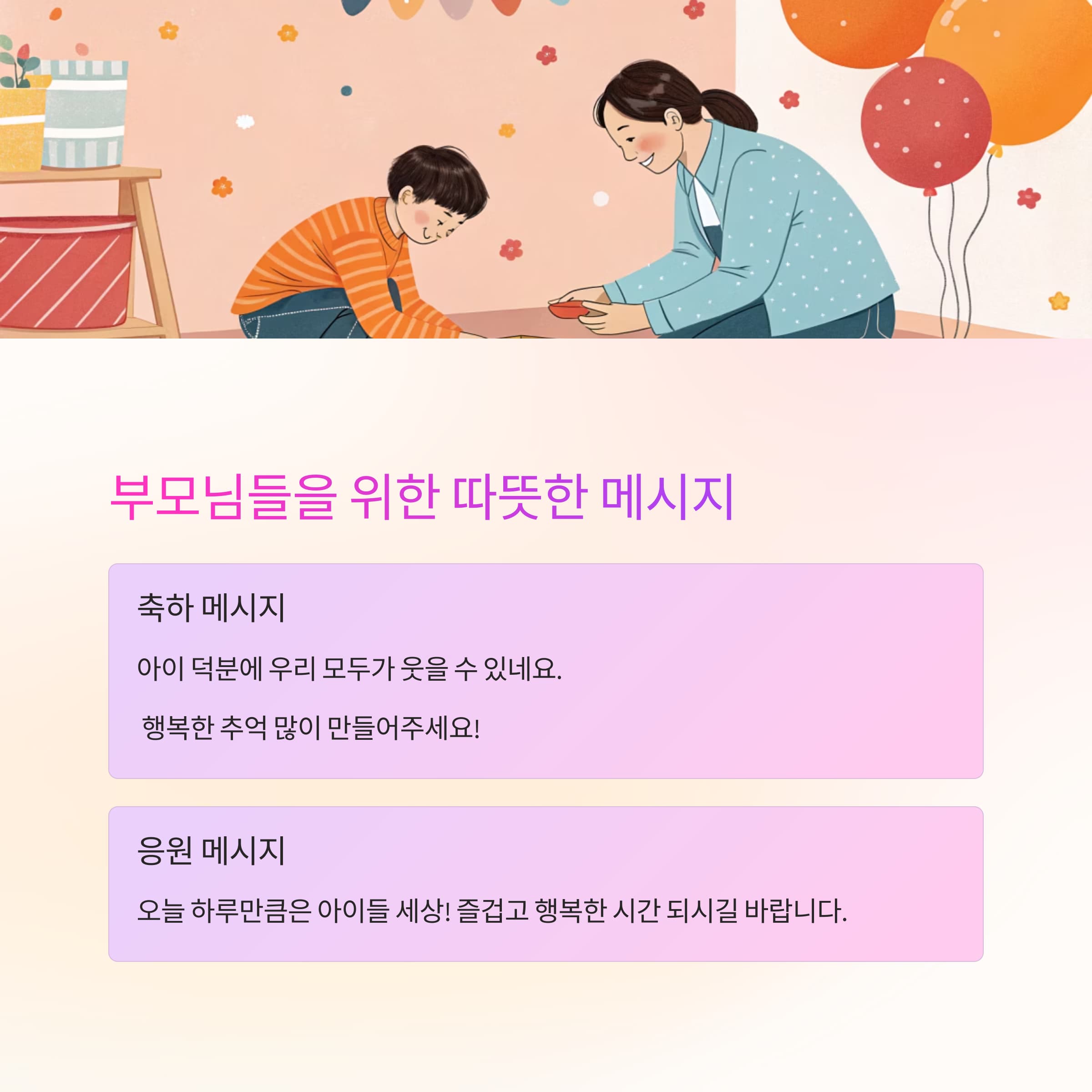 | 알록달록 풍선 & 선물 박스 | "세상에서 제일 소중한 너에게, 특별한 하루를 선물할게!" |