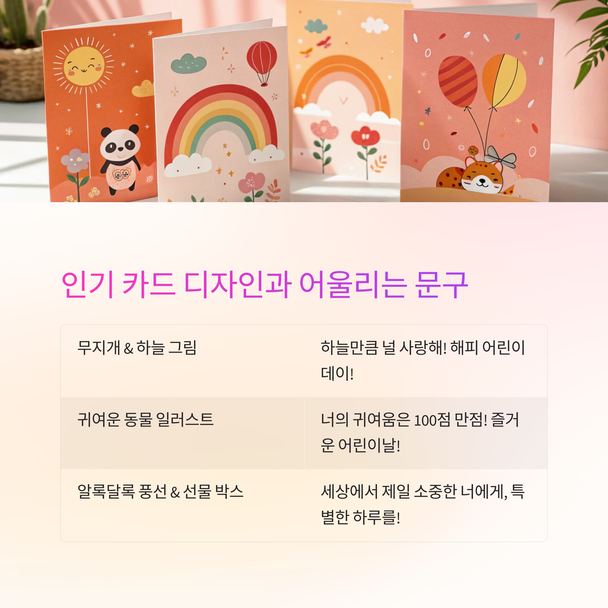 아래 표에서 인기 카드 디자인과 어울리는 문구를 확인해 보세요.