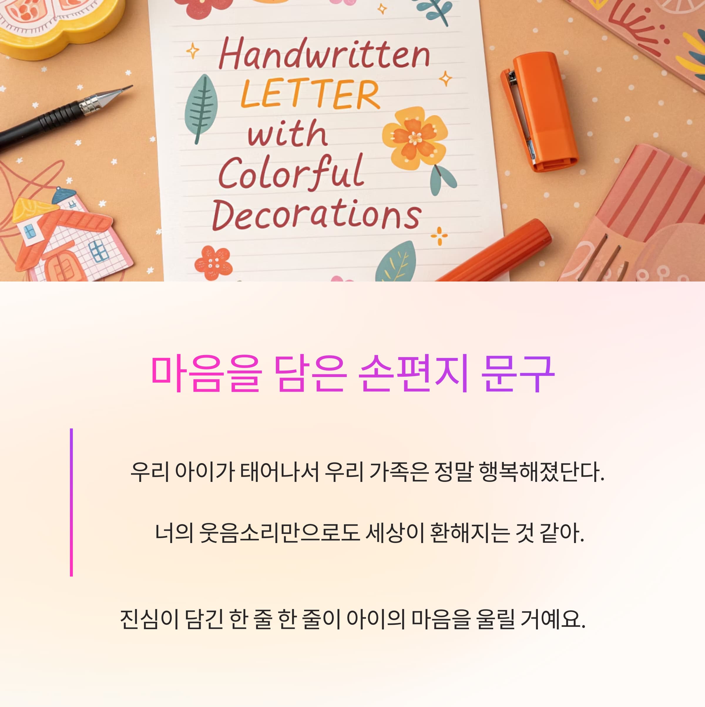 "우리 ○○이가 태어나서 우리 가족은 정말 행복해졌단다. 너의 웃음소리만으로도 세상이 환해지는 것 같아. 앞으로도 건강하고 꿈을 크게 키워나가길 응원할게!"