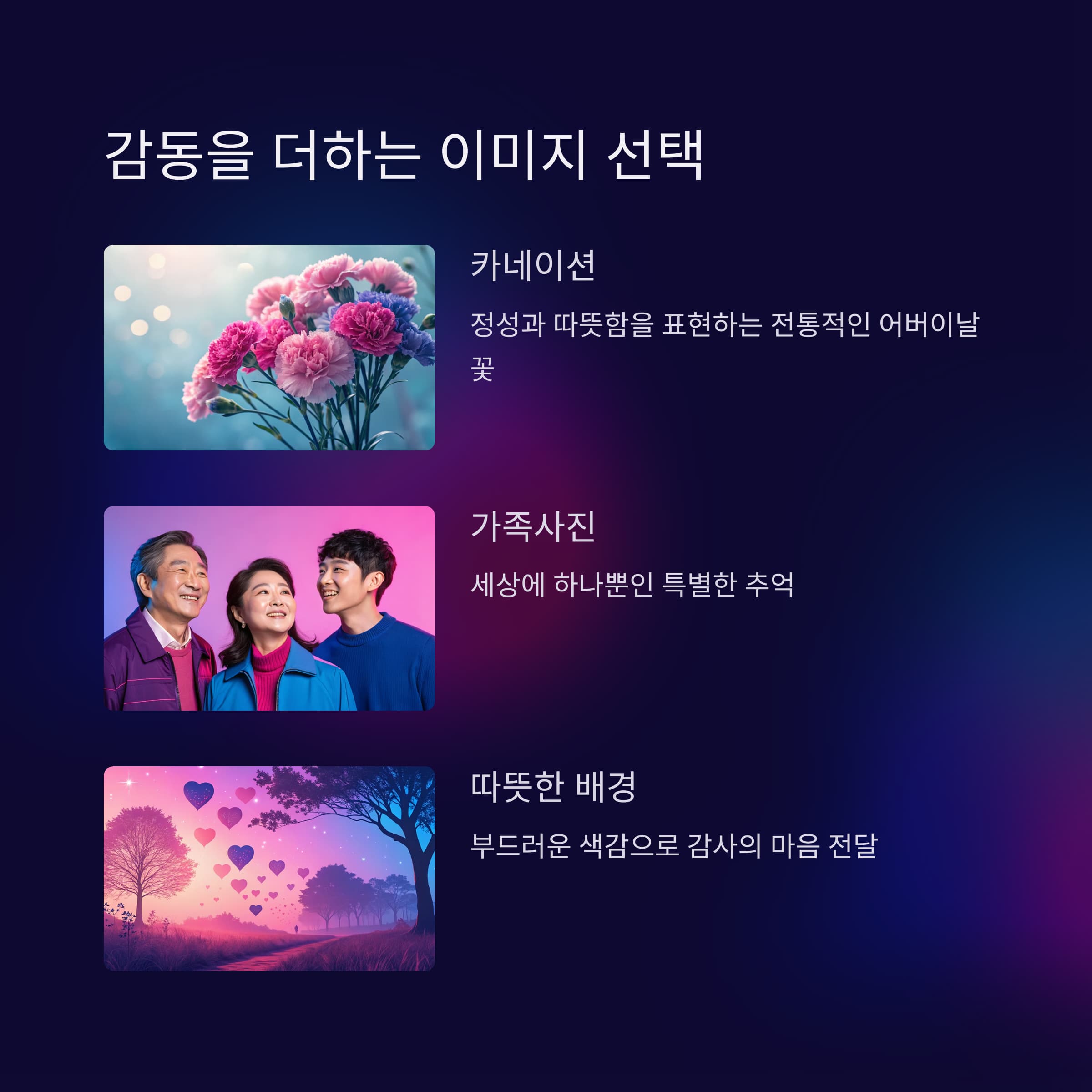 직접 만든 카드나 포스터 이미지를 준비하면 부모님께 큰 감동을 줄 수 있습니다.