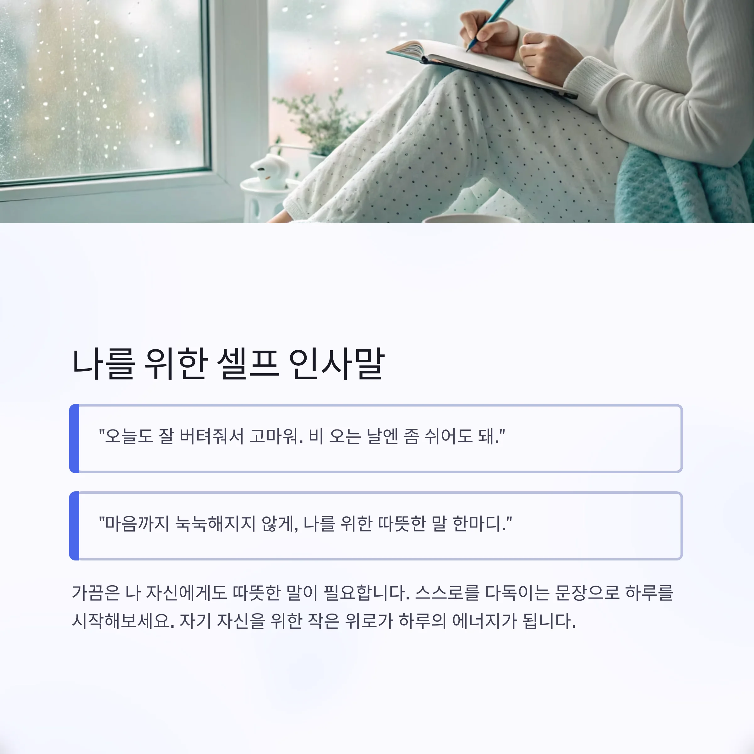 "마음까지 눅눅해지지 않게, 나를 위한 따뜻한 말 한마디."