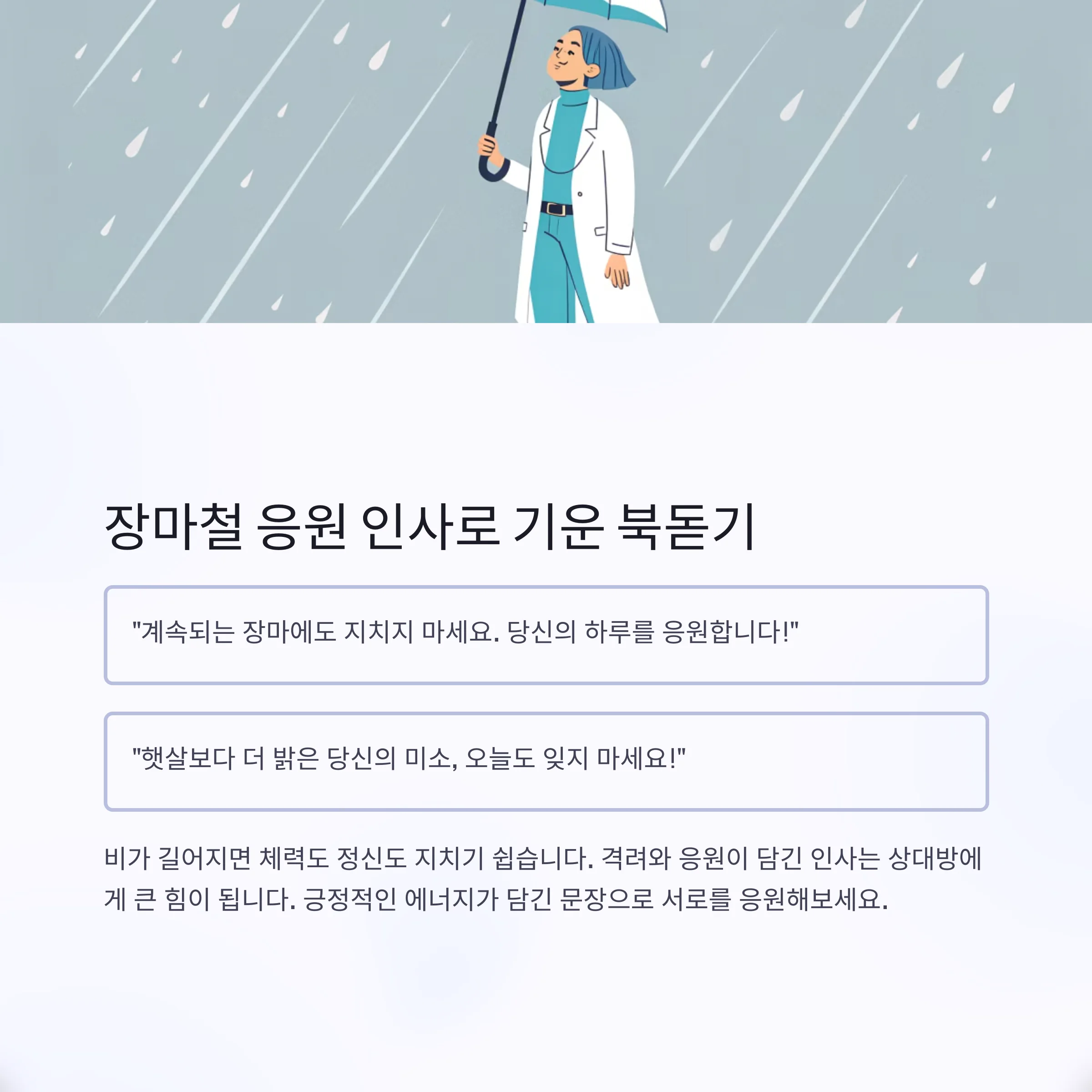 "계속되는 장마에도 지치지 마세요. 당신의 하루를 응원합니다!"