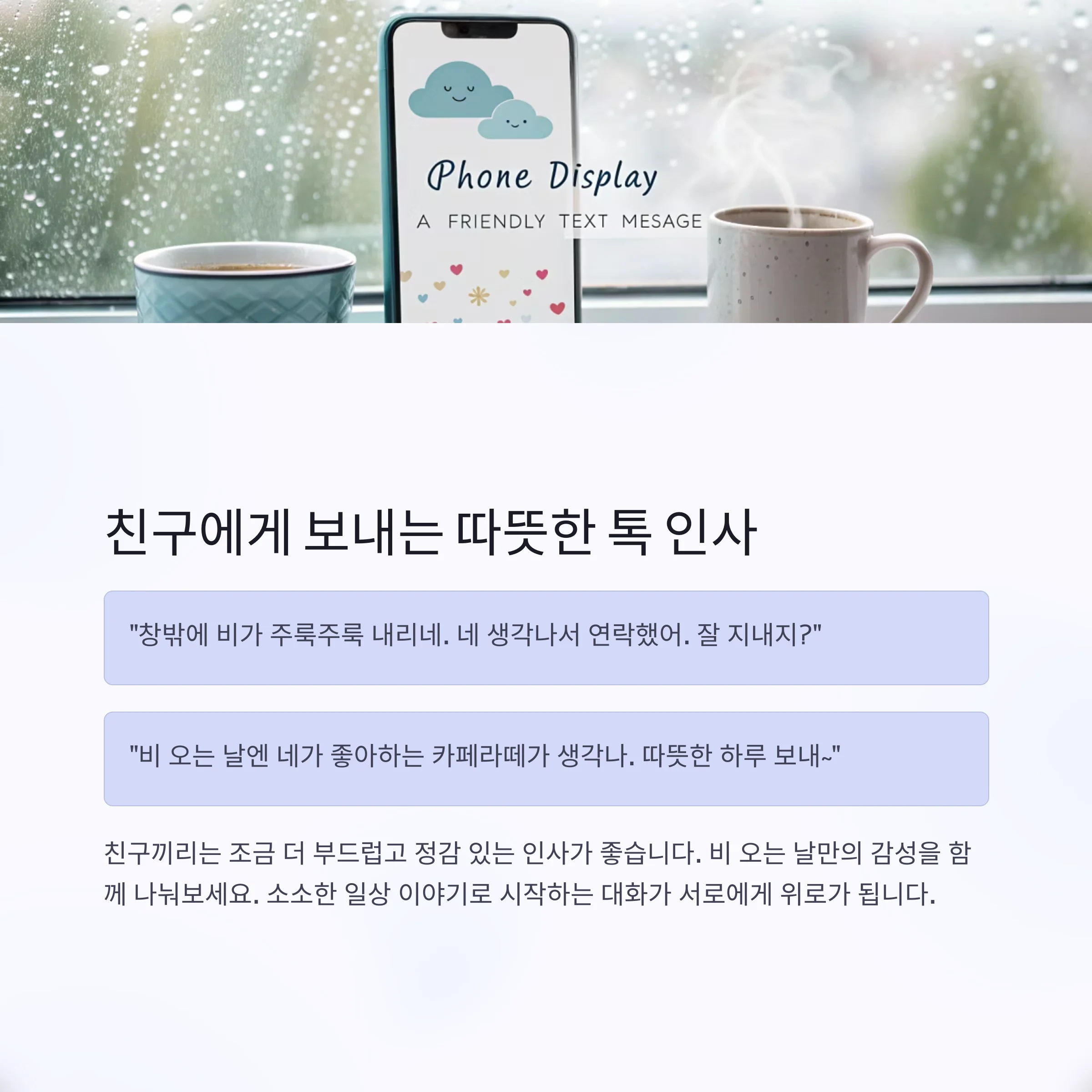"창밖에 비가 주룩주룩 내리네. 네 생각나서 연락했어. 잘 지내지?"