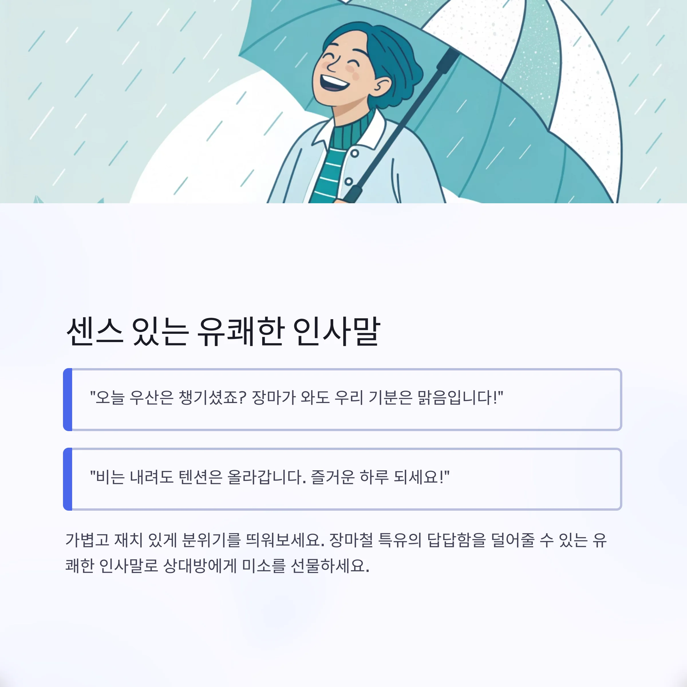 "오늘 우산은 챙기셨죠? 장마가 와도 우리 기분은 맑음입니다!"