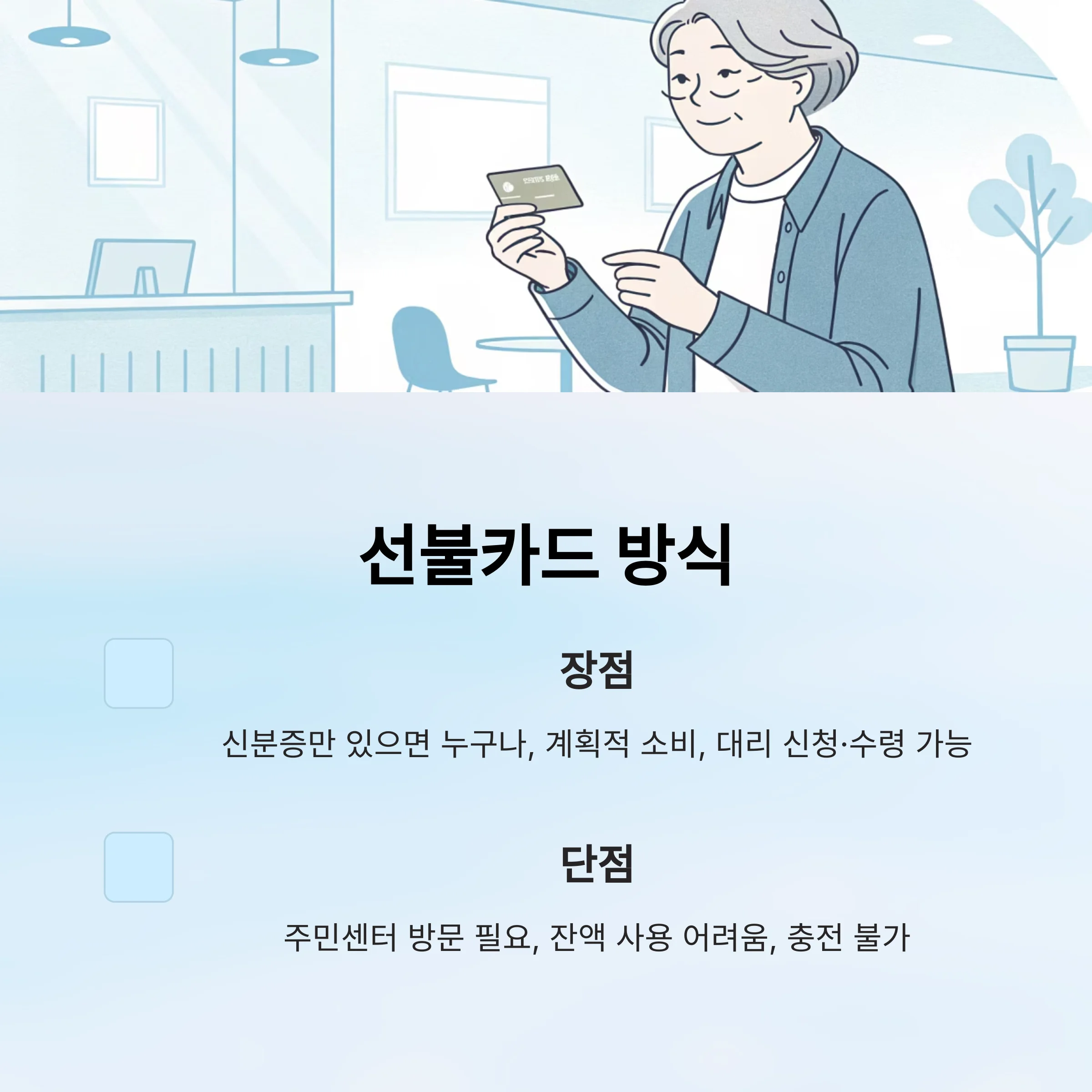 - 장점: 신분증만 있으면 누구나, 계획적 소비, 대리 신청·수령 가능