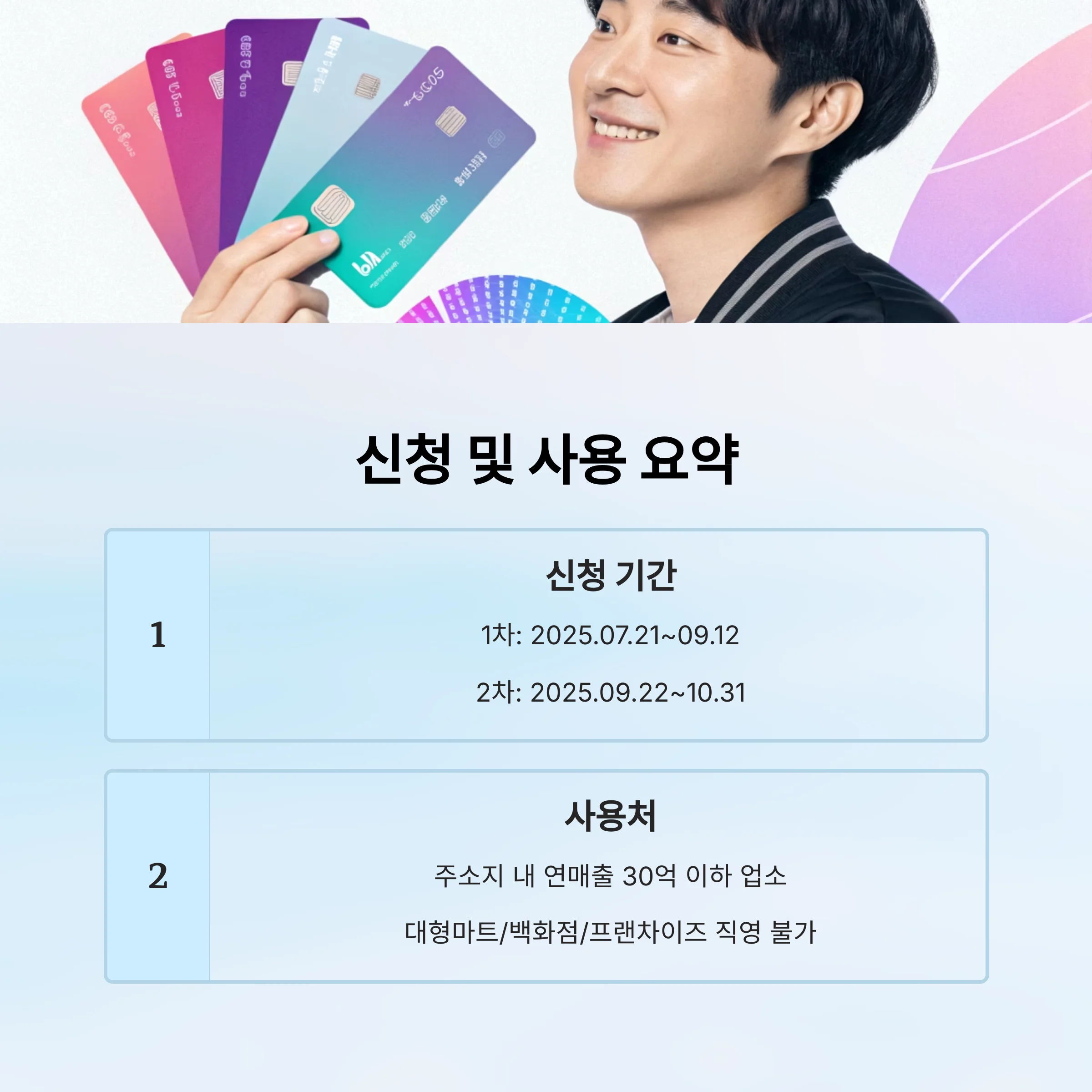 - 사용처: 주소지 내 연매출 30억 원 이하 업소 (전통시장, 일반음식점 등, 대형마트·백화점·프랜차이즈 직영 등 불가)