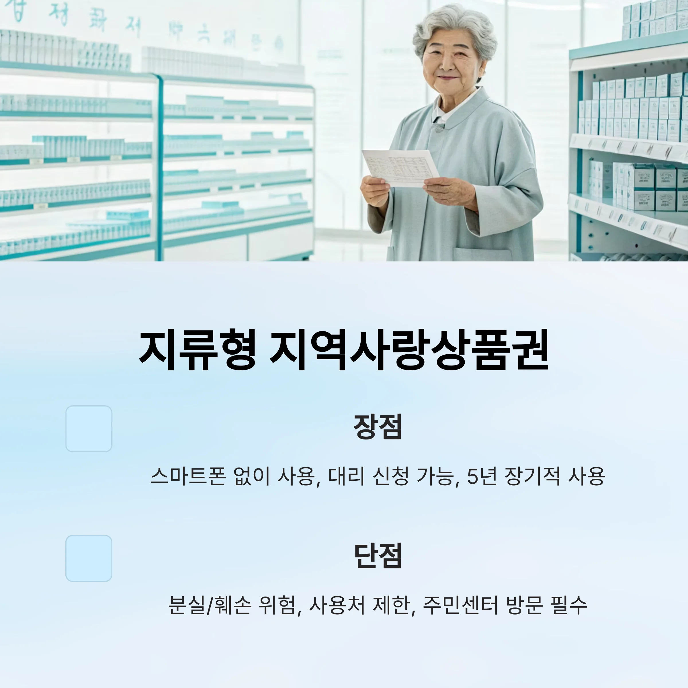 - 단점: 분실/훼손·지연, 사용처 제한, 거스름돈 조건, 주민센터 방문 필수