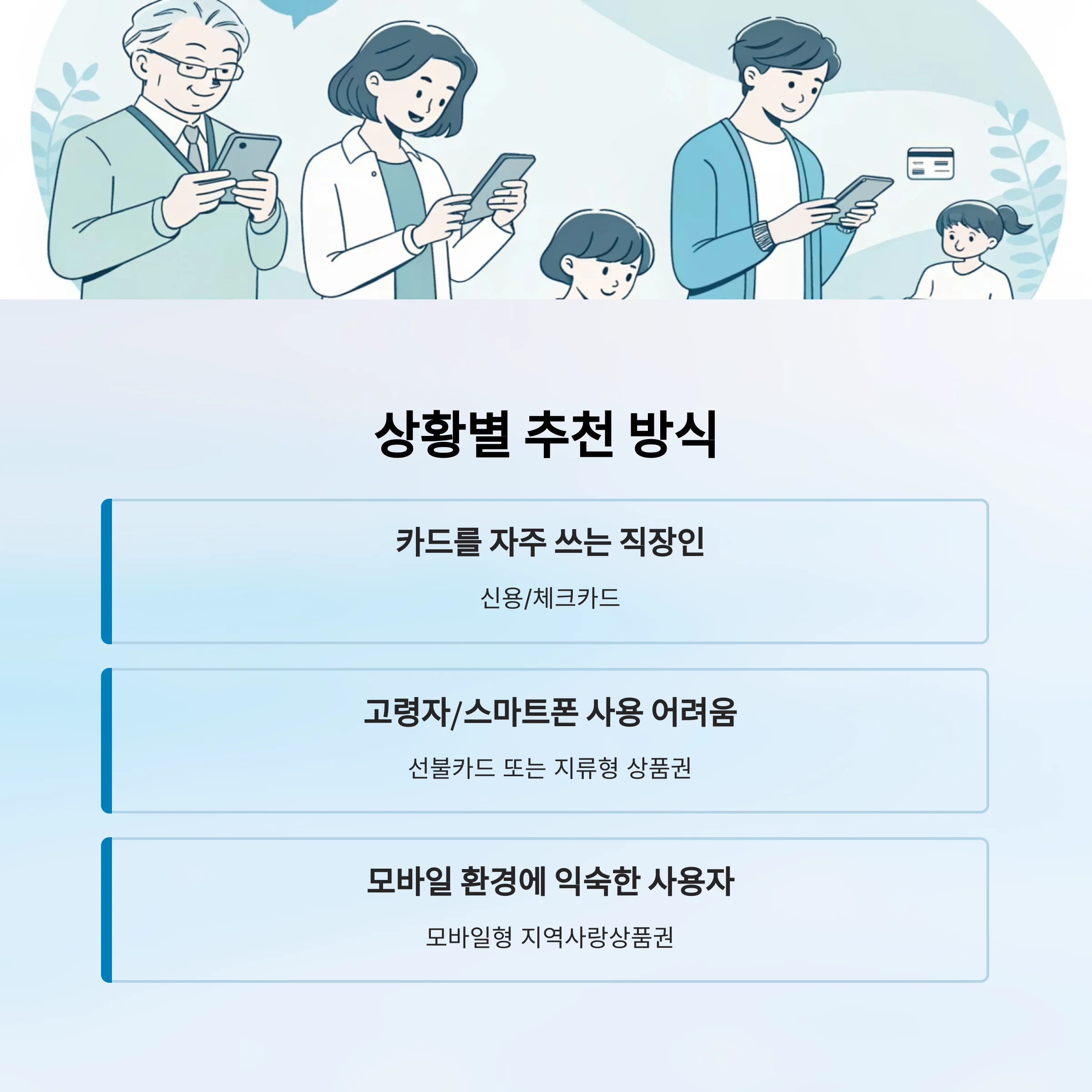 | 고령자 / 스마트폰 사용 어려움 | 선불카드 또는 지류형 상품권 |