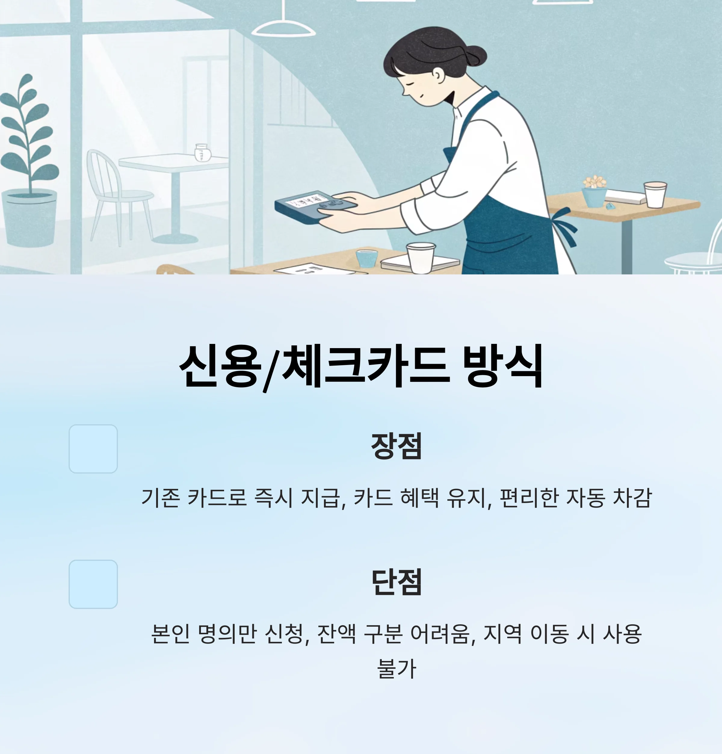 - 장점: 별도 카드 없이 기존 카드로 즉시 지급, 카드 혜택 유지, 편리한 자동 차감