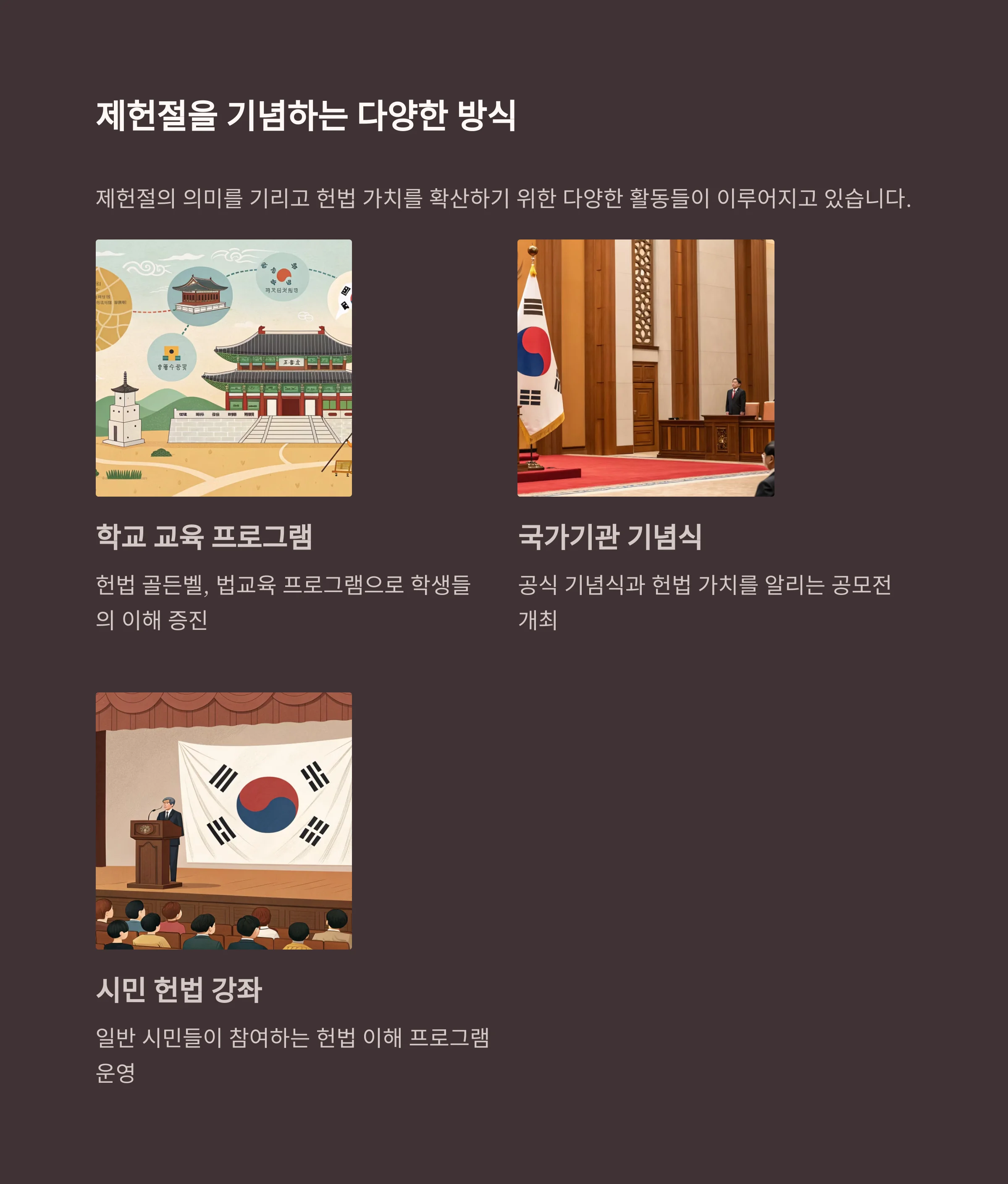 또한 국가기관에서는 기념식과 공모전, 시민 헌법 강좌 등 다양한 행사로 제헌절을 알리고 있습니다.