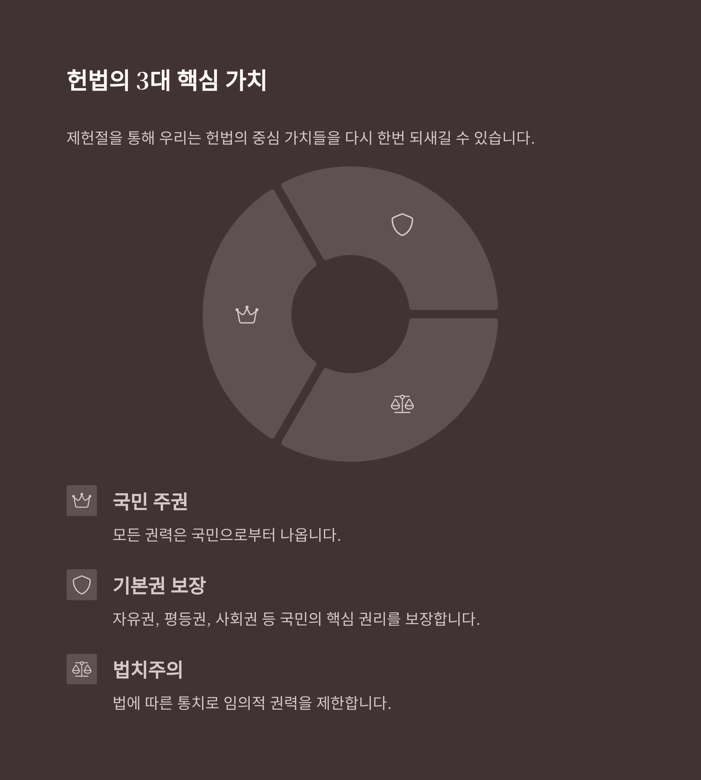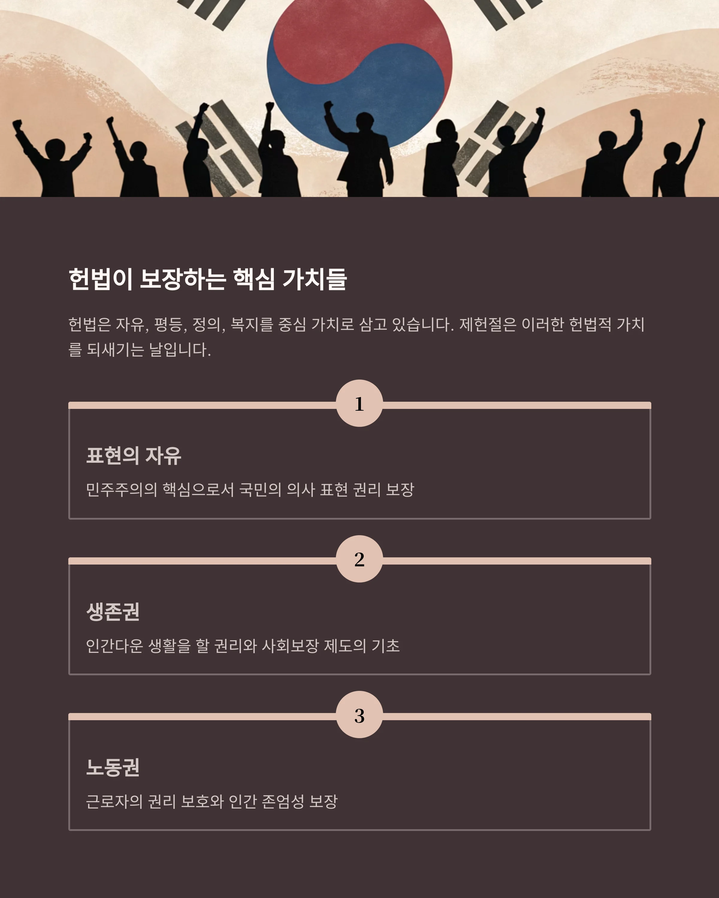 이 세 가지는 헌법의 중심축을 이룹니다. 제헌절을 통해 국민은 이러한 가치들을 다시 한번 되새기고 지켜야 할 의무를 인식하게 됩니다.