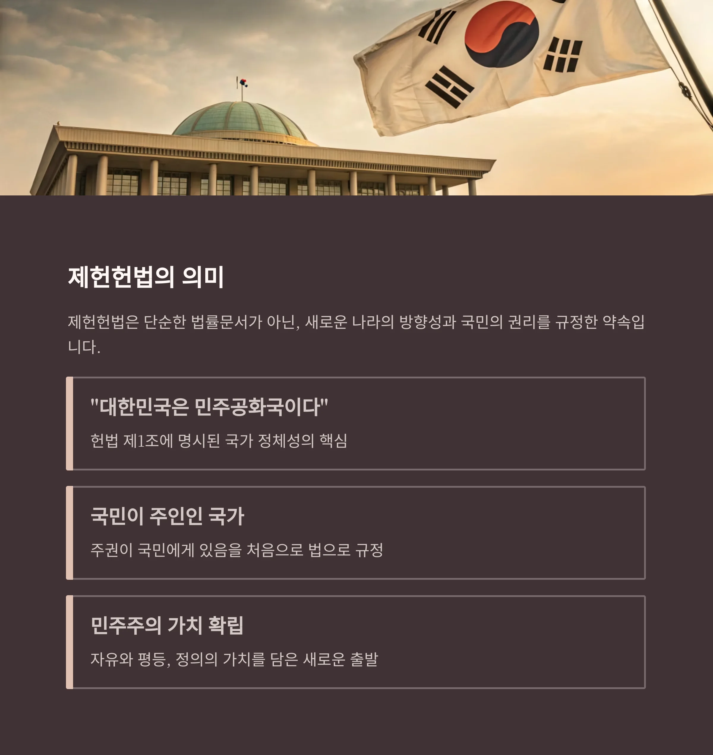 일제강점기 이후 처음으로 자주적 국가를 세우며 헌법을 통해 나라의 운영 원칙을 확립한 날로 평가받습니다.