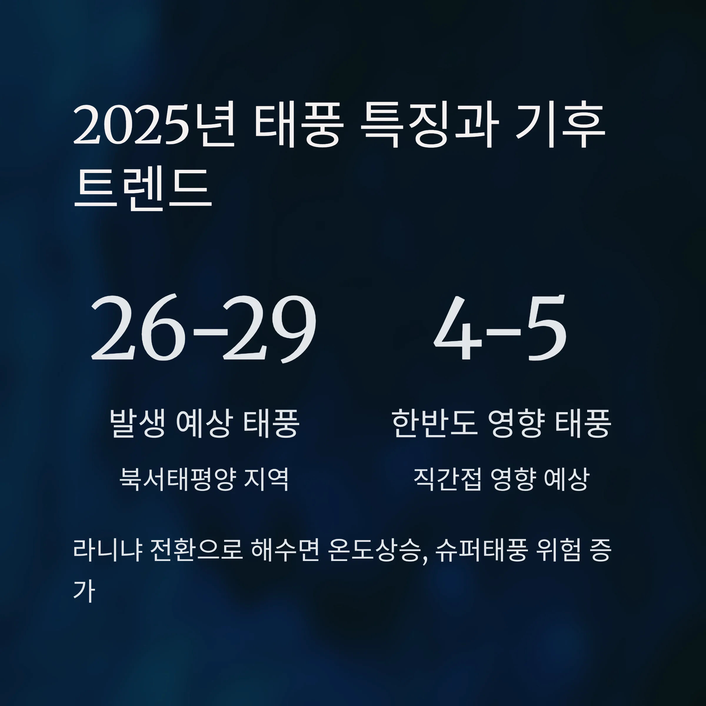 2025년은 북서태평양에서 약 26~29개 태풍이 발생하며, 4~5개가 한반도에 직접 또는 간접 영향을 미칠 것으로 주요 기상기관들이 전망하고 있습니다.