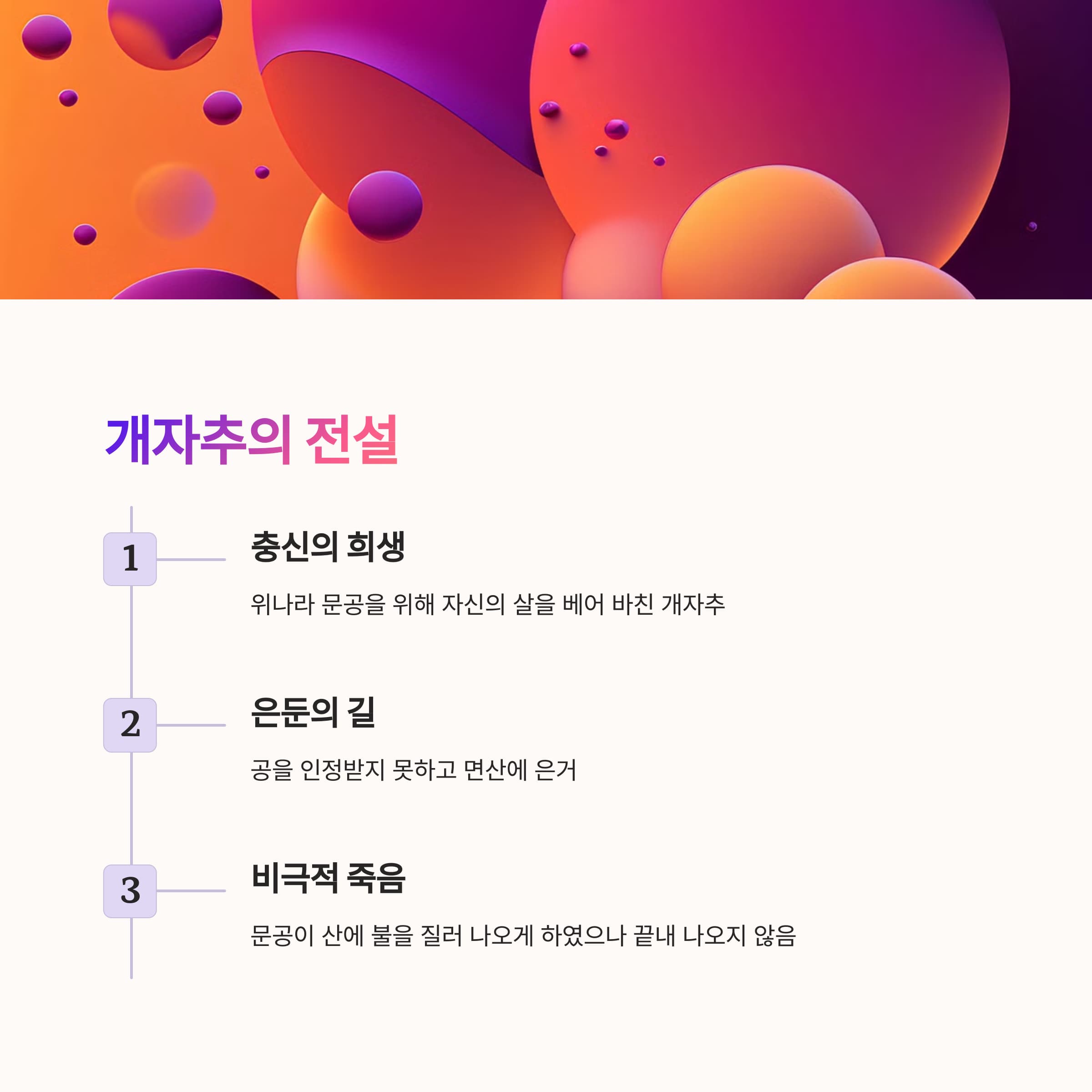개자추가 왕이 된 문공에게 충성을 다했지만 인정을 받지 못하자 산속으로 들어가 숨게 되었고, 이를 찾기 위해 불을 질렀다가 개자추가 불에 타 죽었다는 전설이 있습니다.