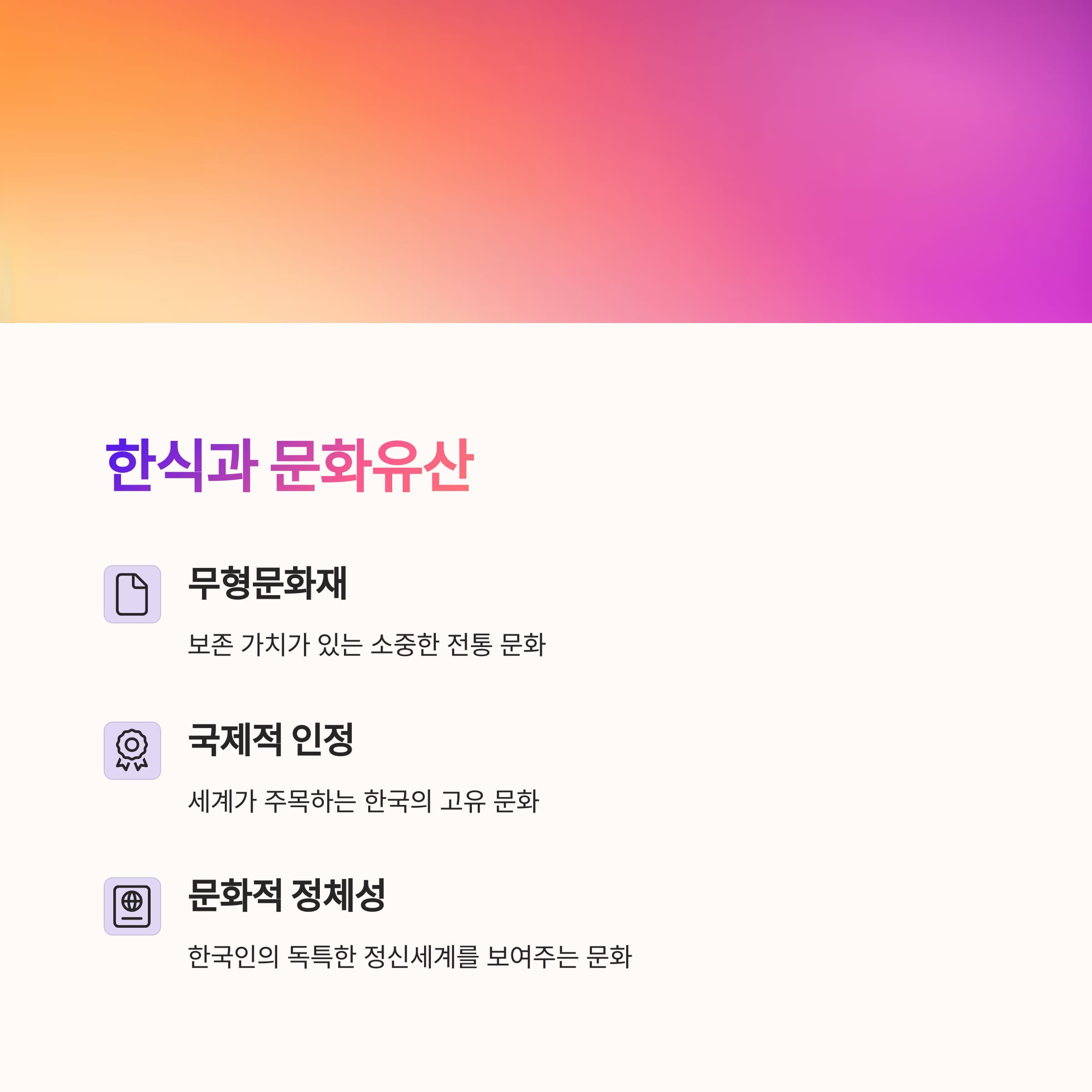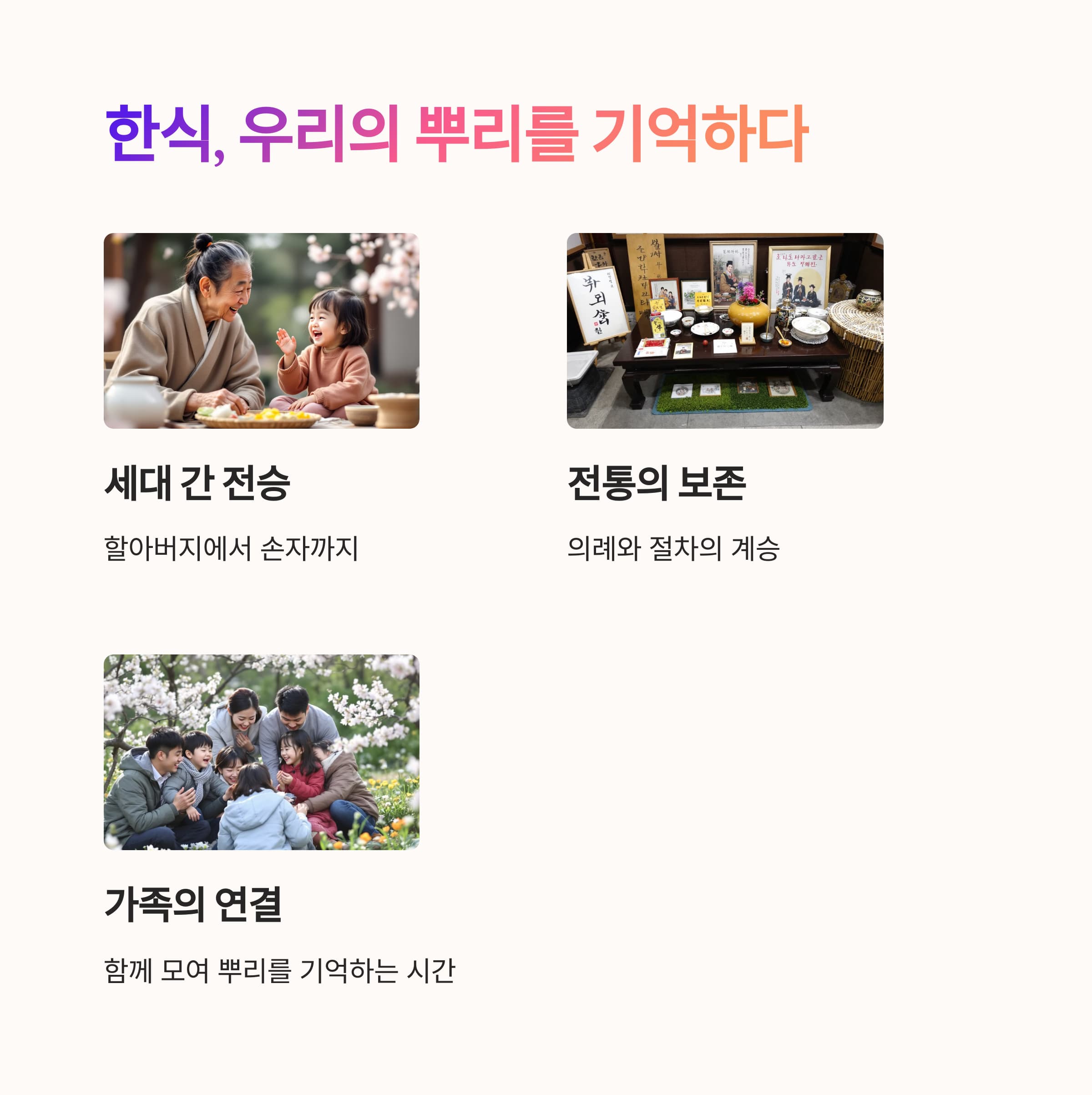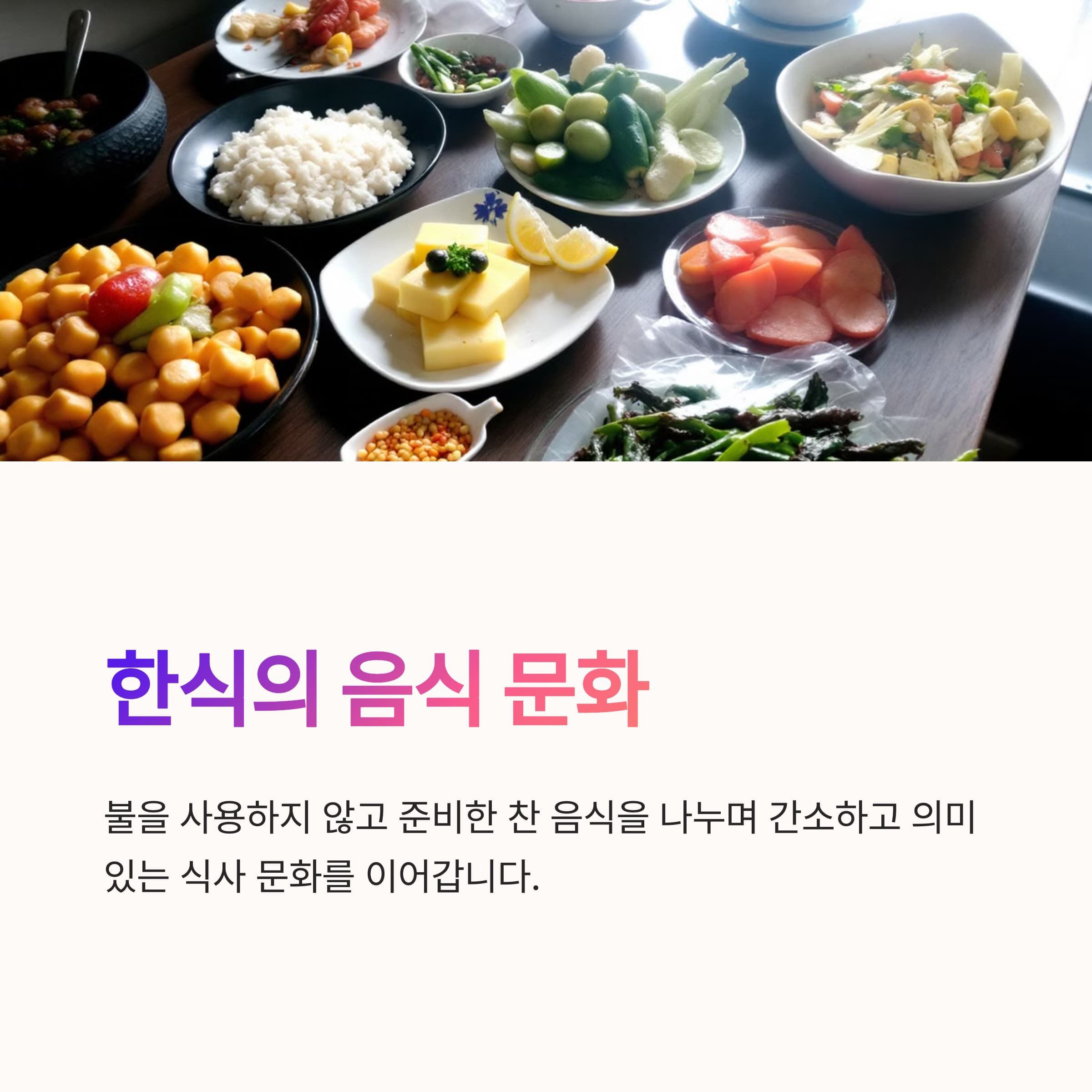 또한 블로그나 SNS를 통해 한식의 의미를 소개하고 공유하는 것도 전통문화의 현대적 계승이 될 수 있습니다.