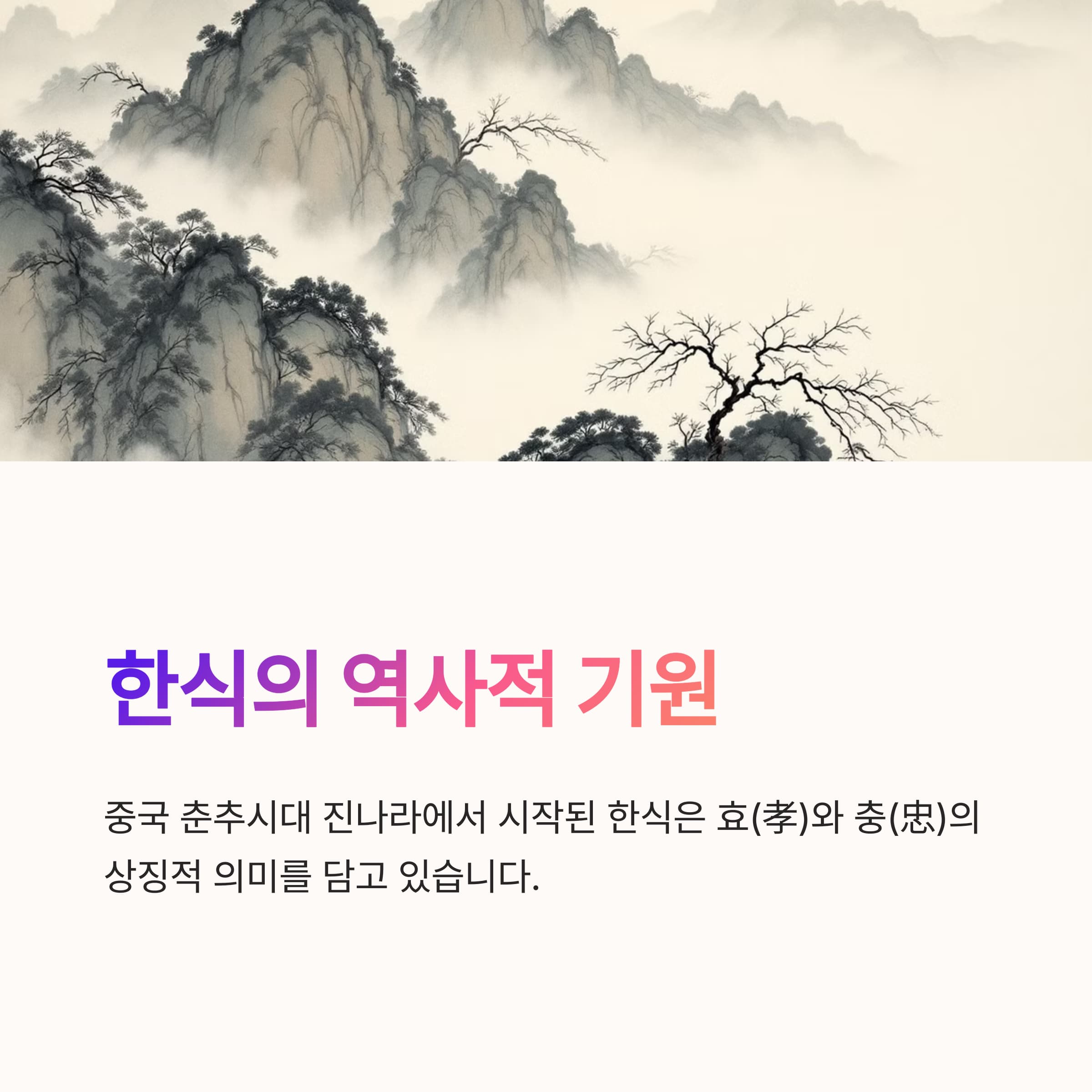 한식의 기원은 중국의 춘추시대 진나라 때 충신 개자추의 이야기에서 비롯되었다고 전해집니다.