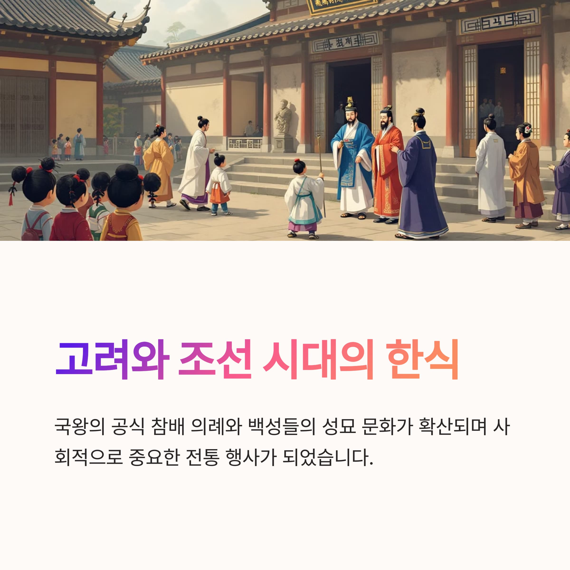 고려와 조선 시대에는 이 날을 매우 중시하며, 국왕이 직접 조상의 능을 참배하고 백성들 또한 성묘를 다니며 조상을 기리는 날로 여겼습니다.