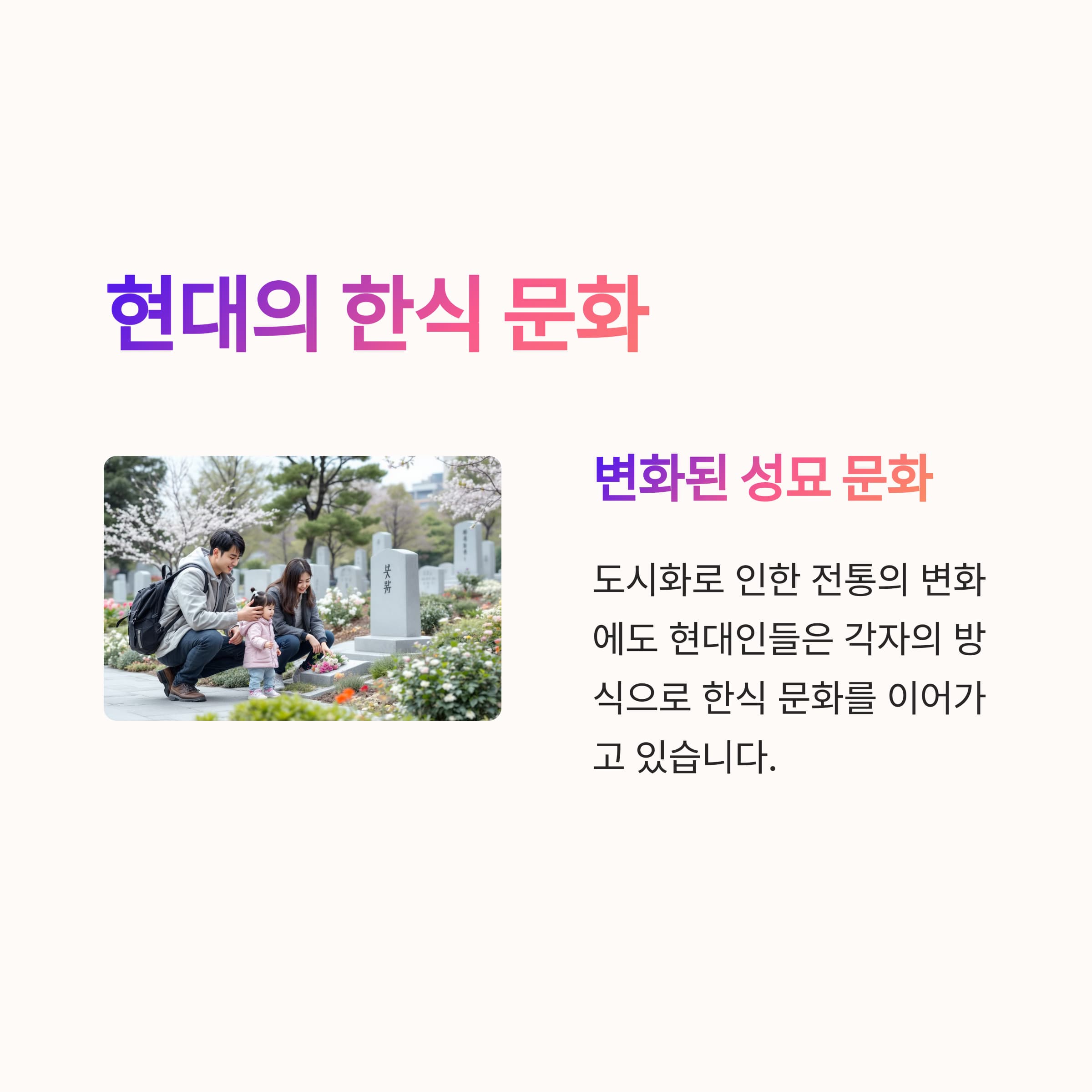 현대에 와서는 한식을 명확히 지키는 가정이 줄어들었지만, 절기를 통해 자연과 조상을 기억하는 마음은 여전히 중요합니다.