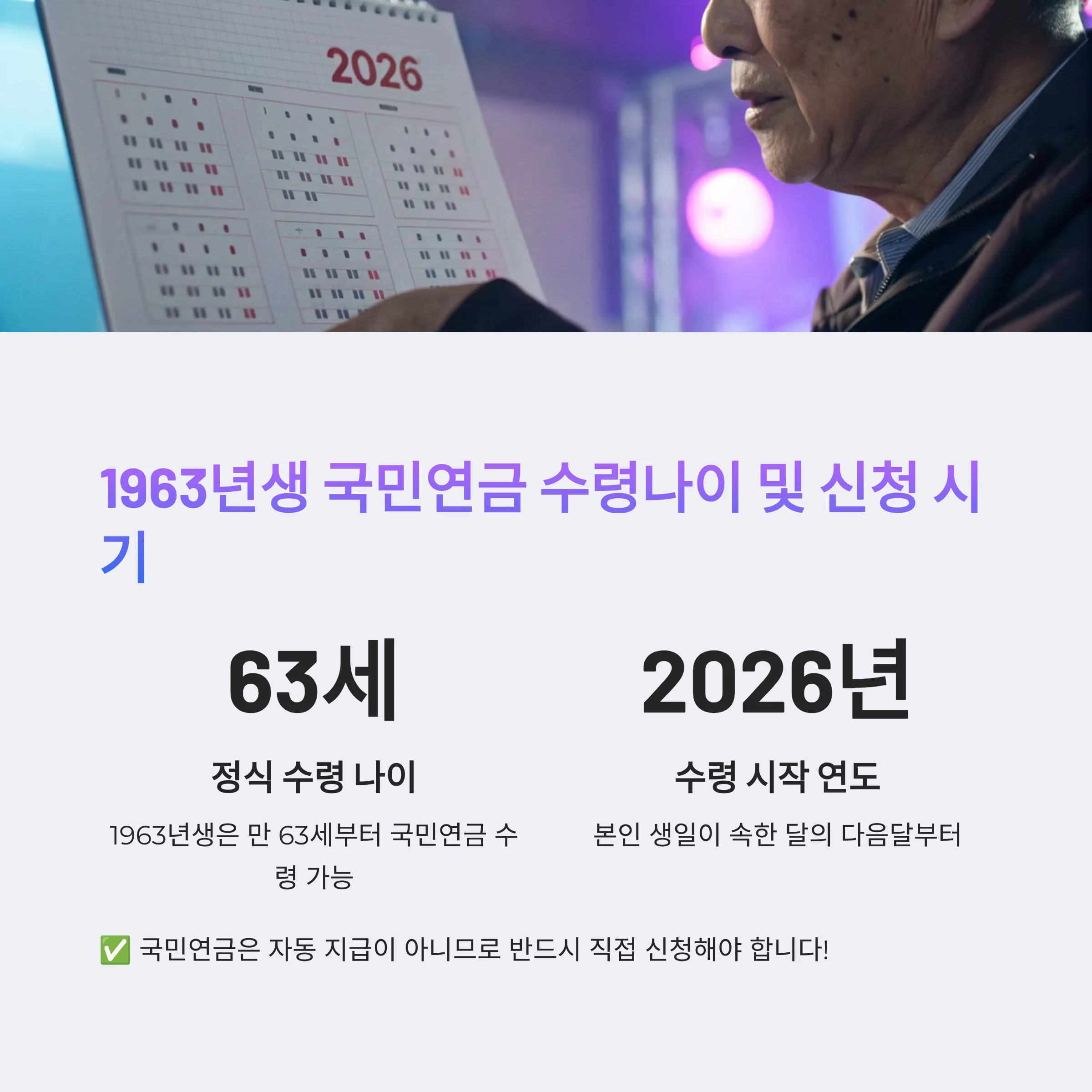 1963년생은 2026년, 본인 생일이 속한 달의 다음 달부터 연금 수령이 가능합니다.