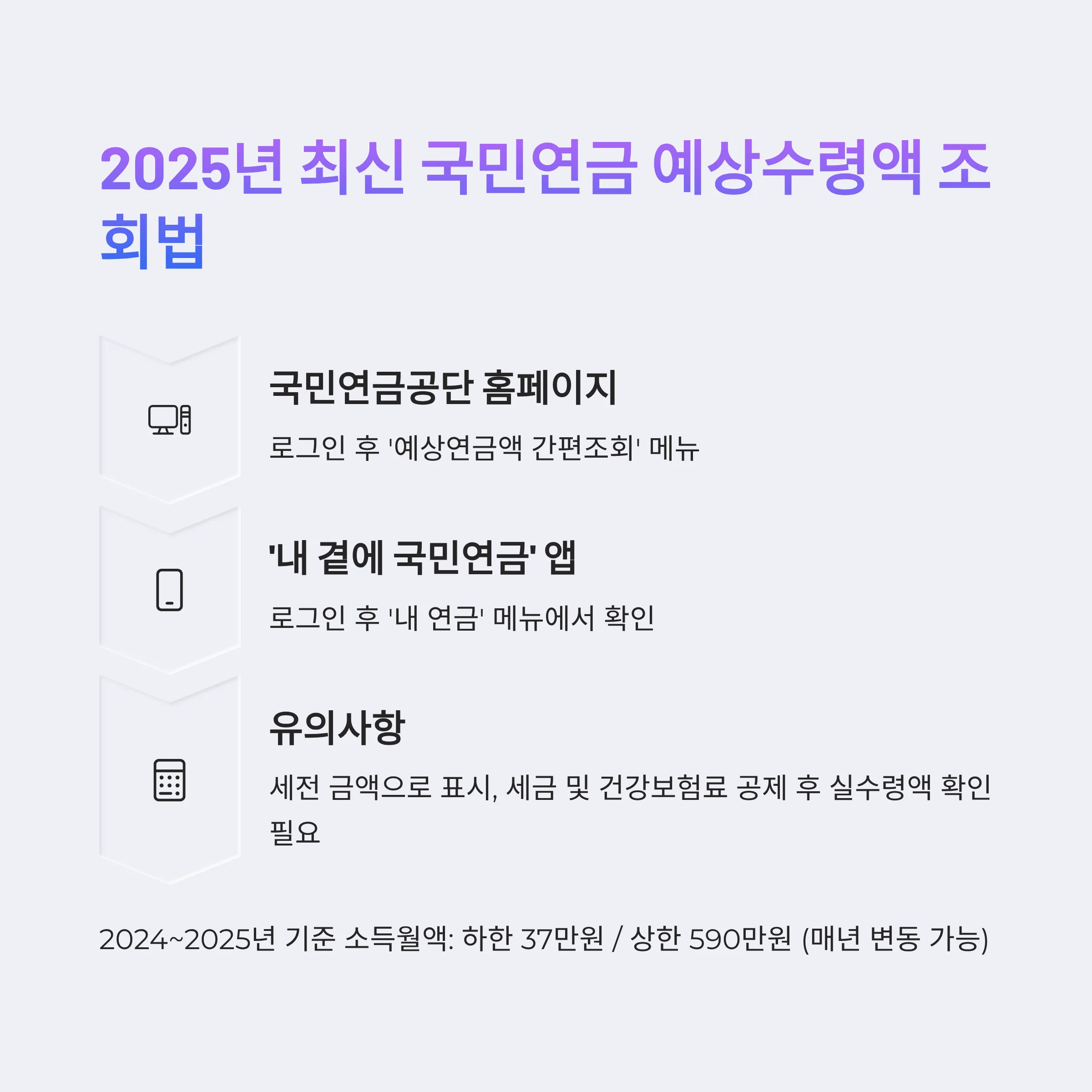 2024~2025년 기준, 소득월액 하한 37만 원/상한 590만 원이 적용되고 있으며(매년 변경 가능), 연금액은 세전 기준입니다.