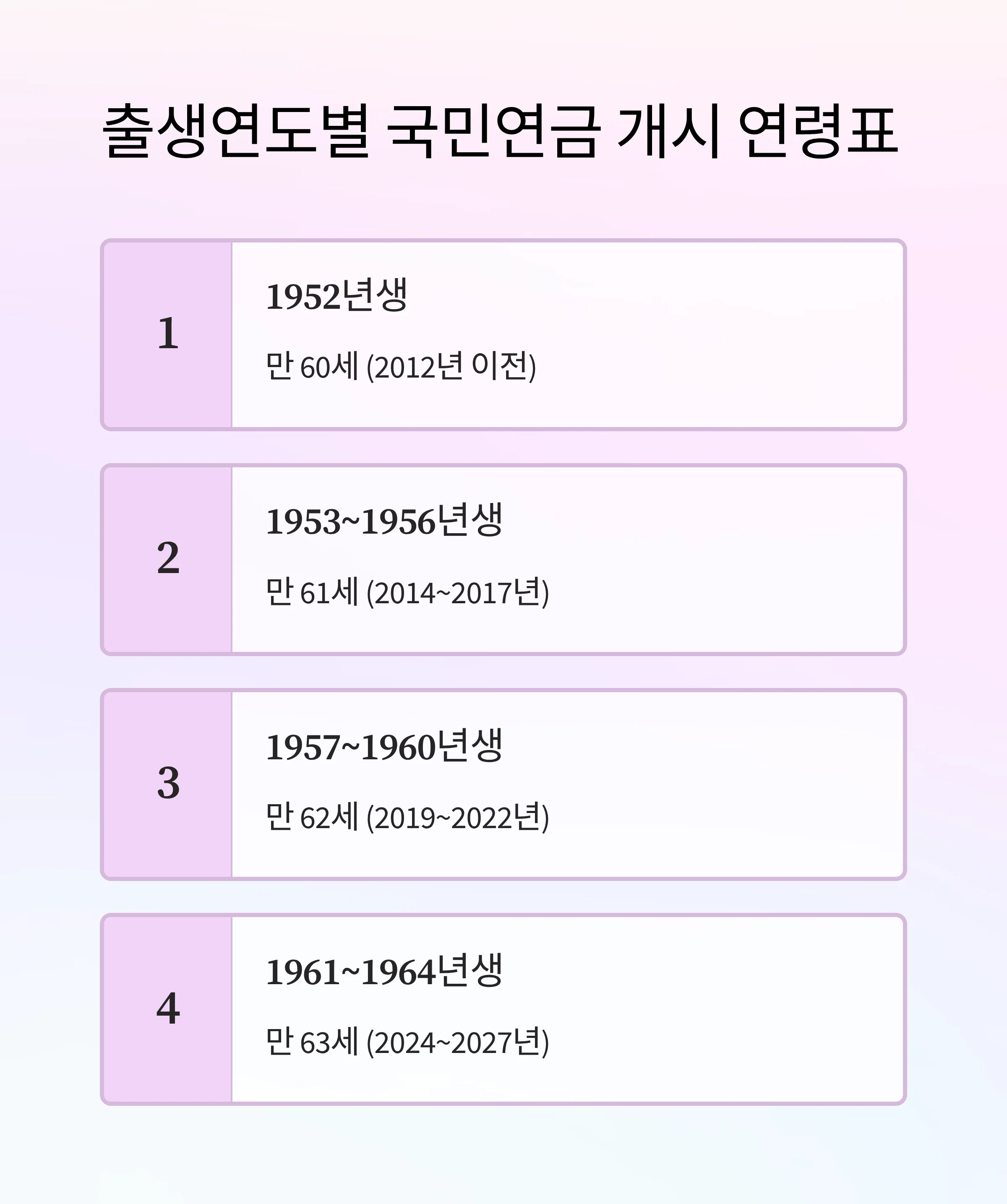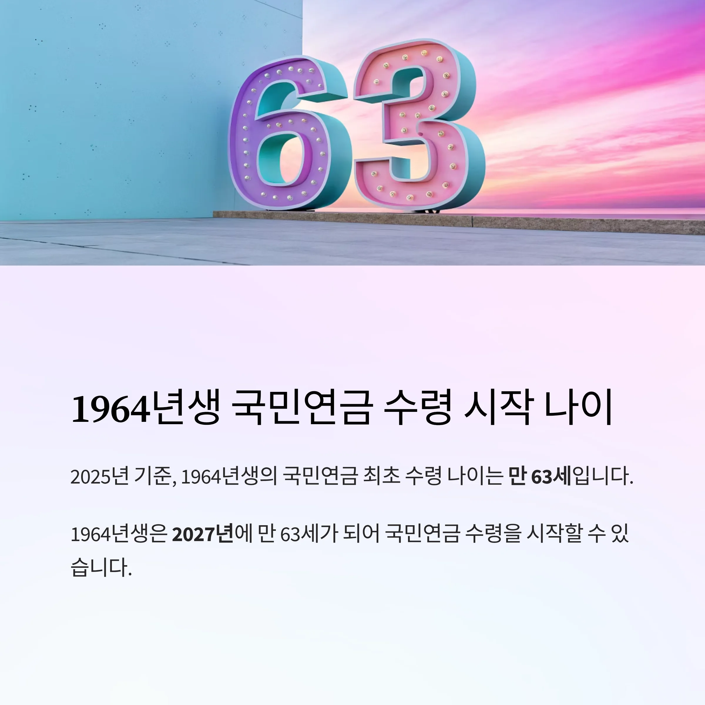 출생연도별 연금 개시 연령이 단계적으로 높아져, 1964년생은 만 63세 적용을 받습니다.
