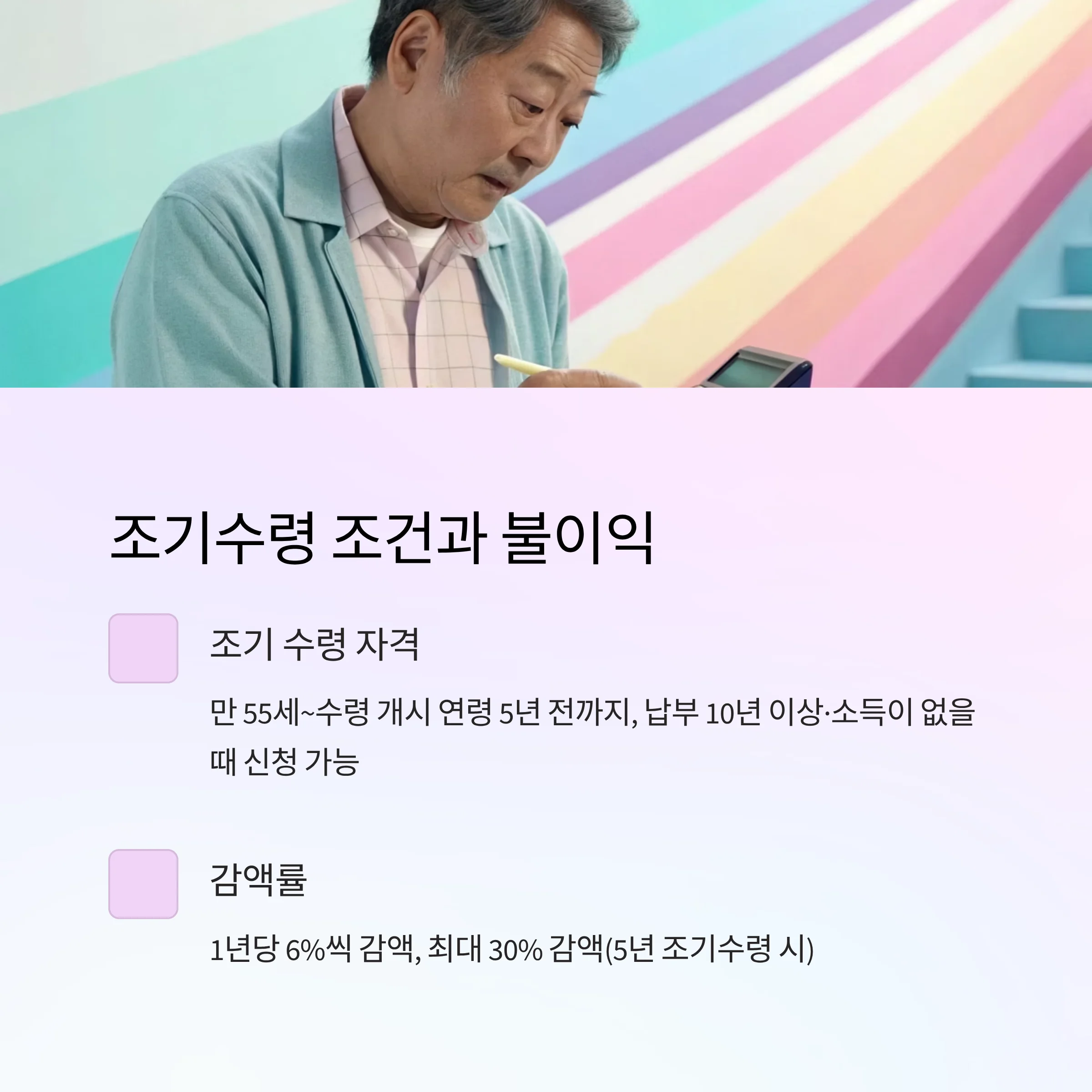 - 조기 수령: 만 55세~수령 개시 연령 5년 전까지, 납부 10년 이상·소득이 없을 때 신청 가능 [1년 당 6% 감액, 최대 30% 감액(5년 조기수령 시)]