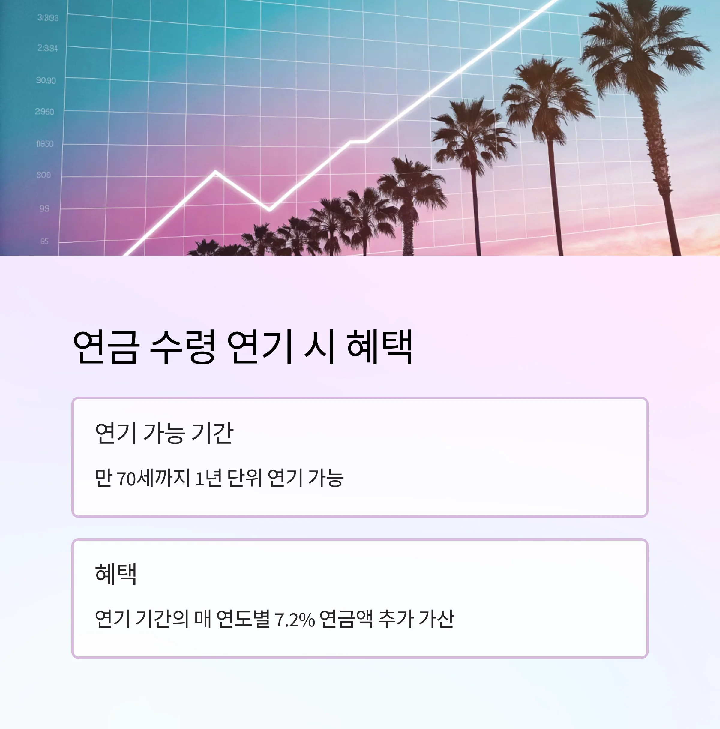 - 연기 수령: 만 70세까지 1년 단위 연기 가능. 연기 기간의 매 연도별 7.2% 연금액 추가 가산
